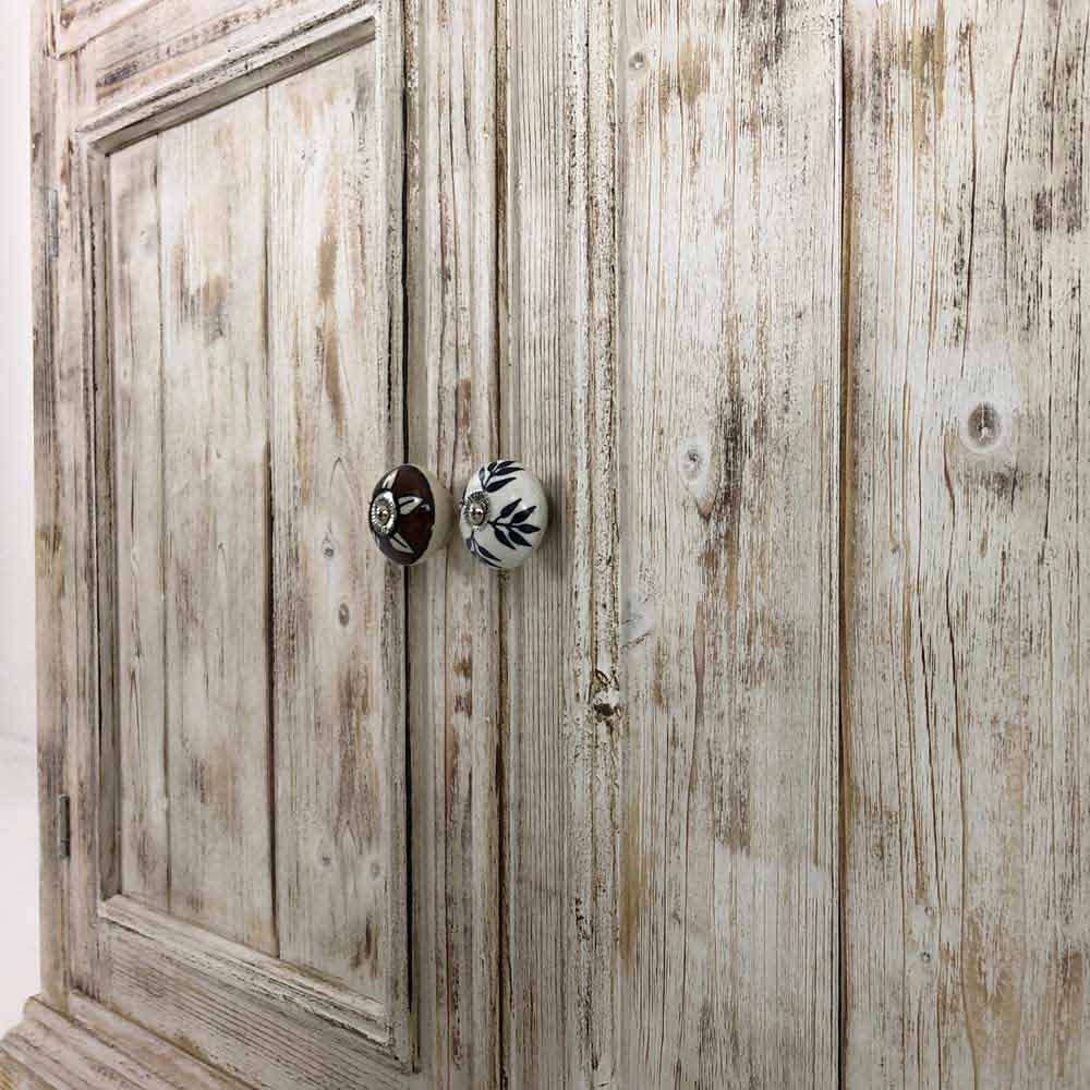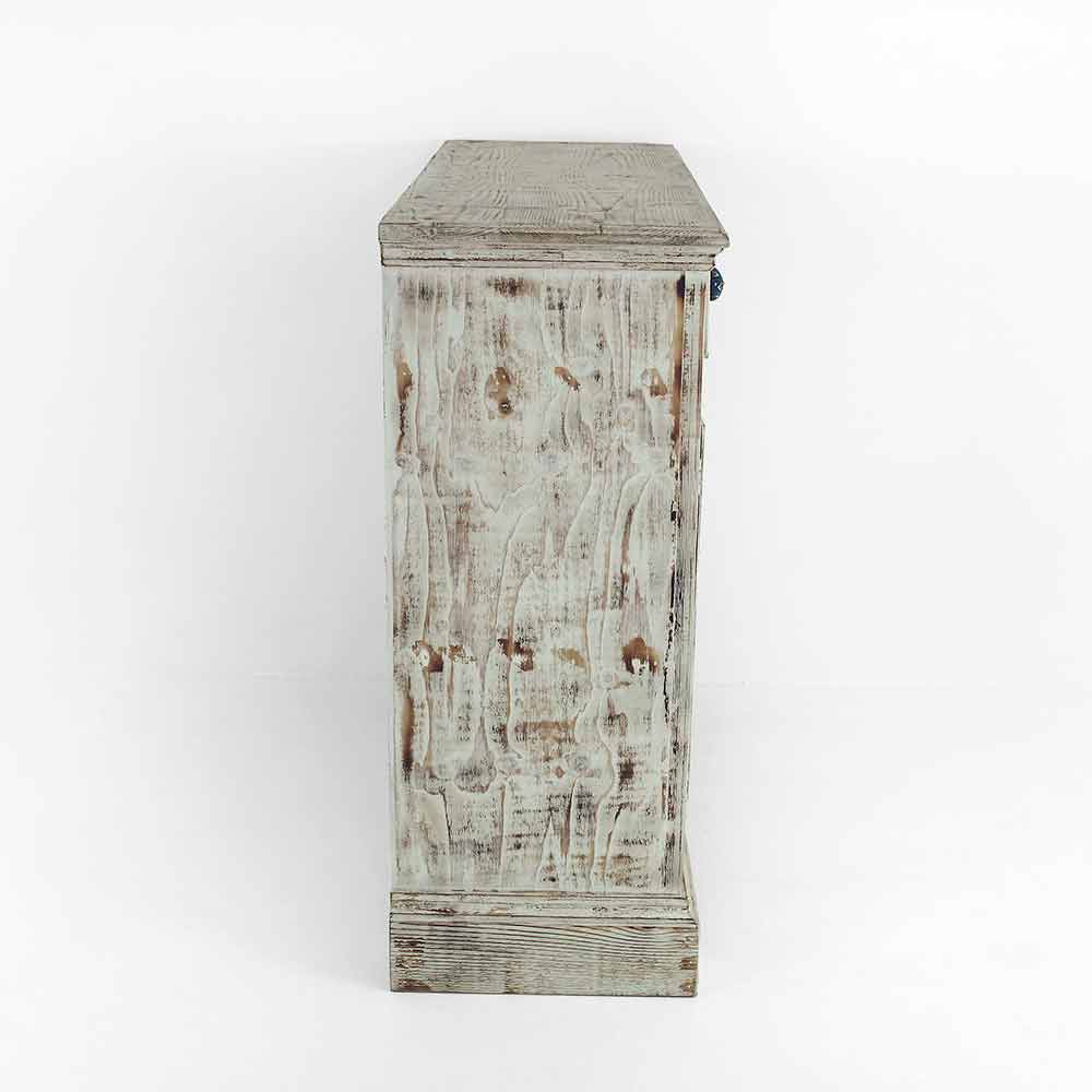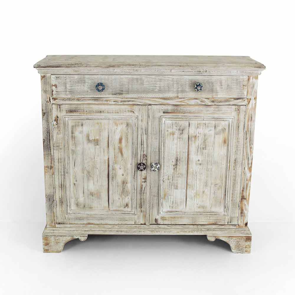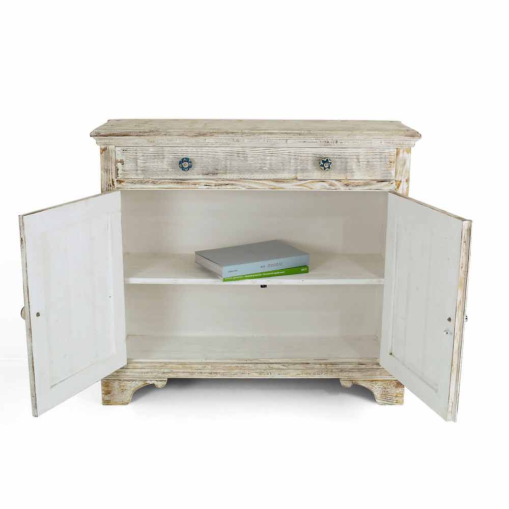 Kredens z litego drewna jodłowego w całości wykonany ręcznie we Włoszech i charakteryzujący się wspaniałym wypalanym płomieniem wykończeniem, które podkreśla szczególne usłojenie drewna, które sprawia, że produkt jest wyjątkowy. Kredens jest następnie wykończony postarzaną białą farbą i wykończony przezroczystym wykończeniem, które sprawia, że jest wodoodporny i utrwala kolory, aby z czasem stały się niezmienne. Jego konstrukcja obejmuje 2 drzwi z wewnętrzną półką i 1 szufladę z dnem ze sklejki topolowej, które są uzupełnione specjalnymi, ręcznie malowanymi ceramicznymi gałkami , które zapewniają doskonale zorganizowaną przestrzeń.