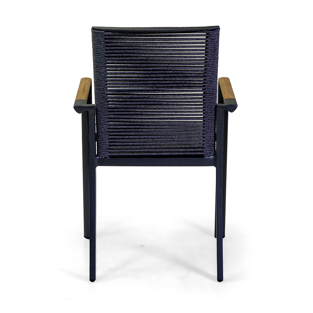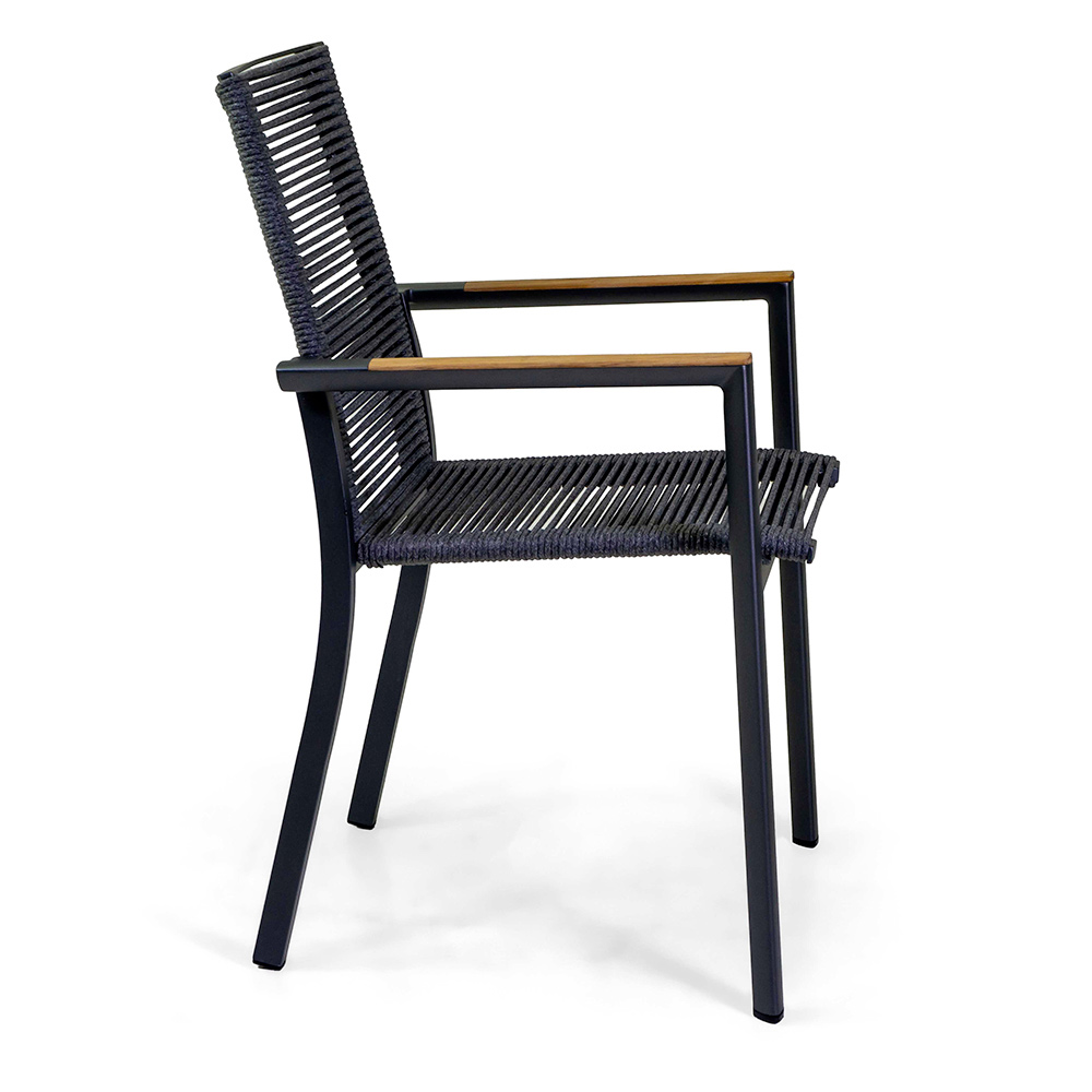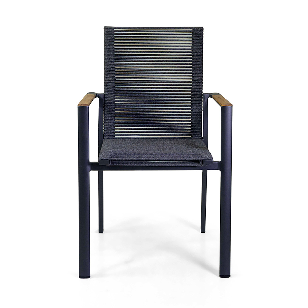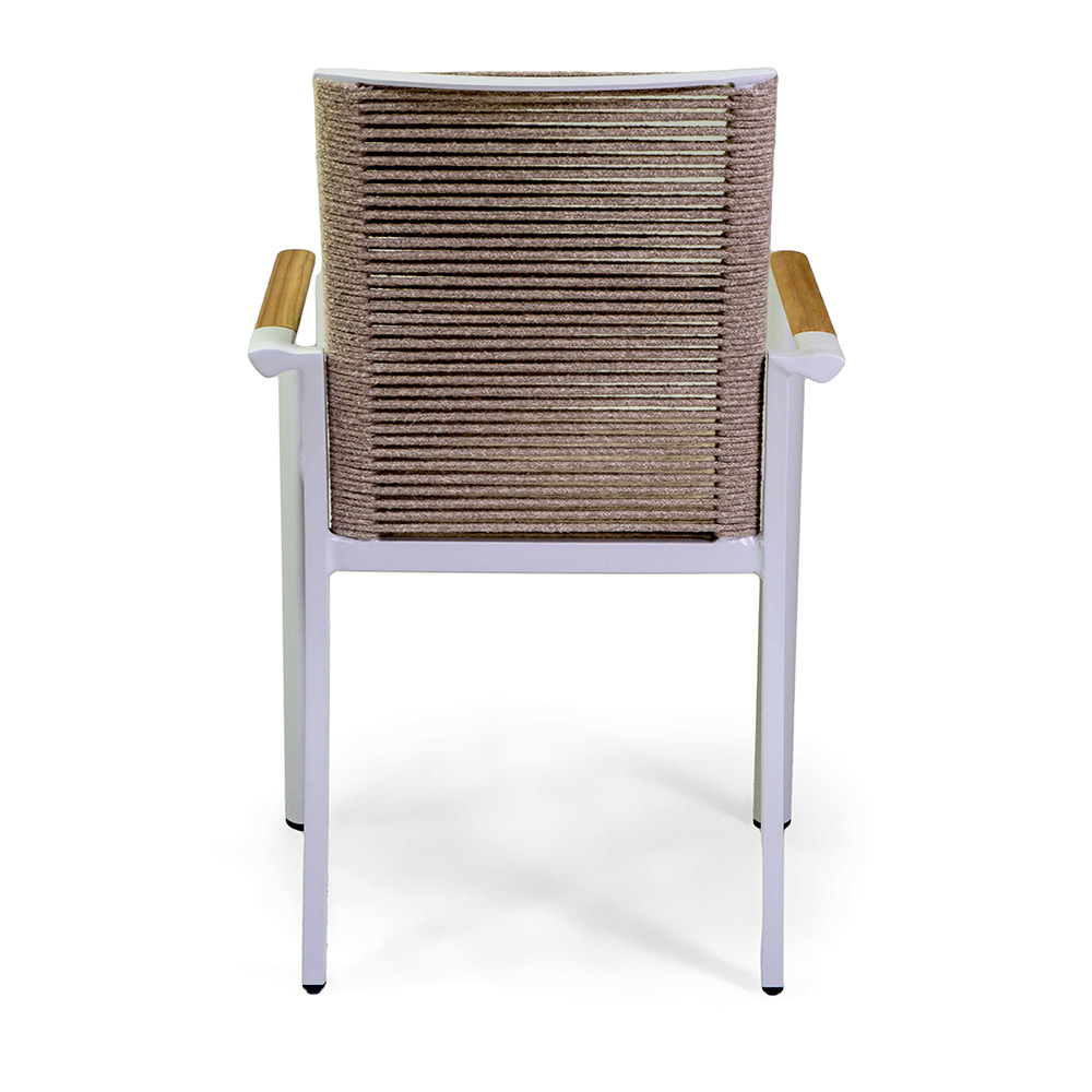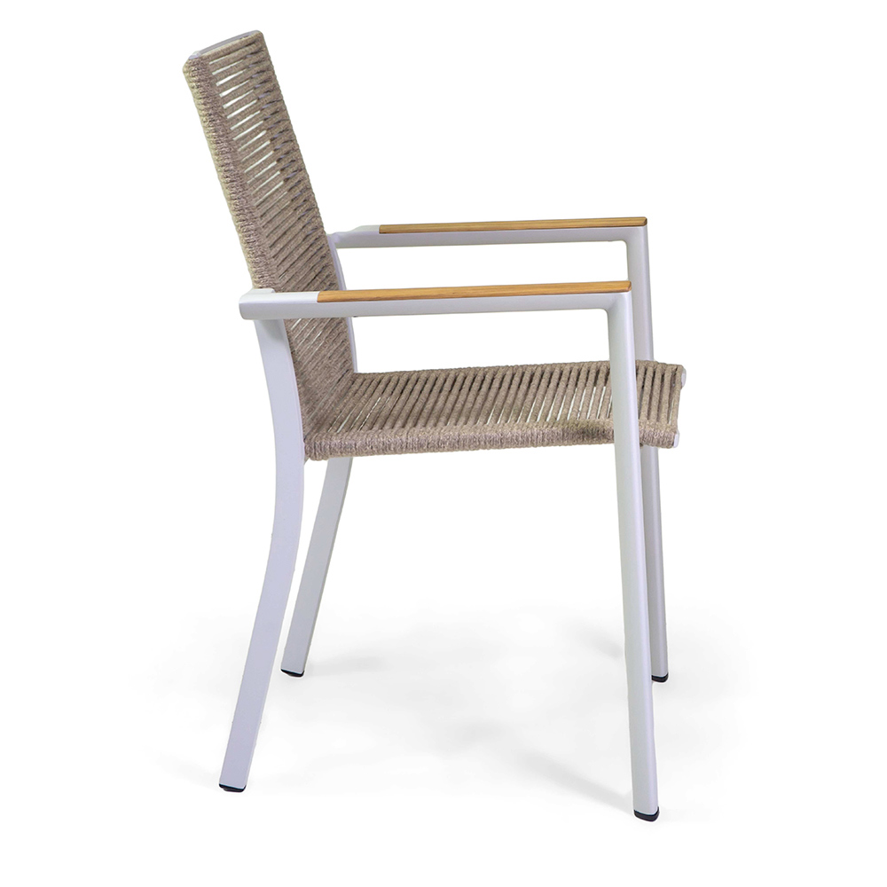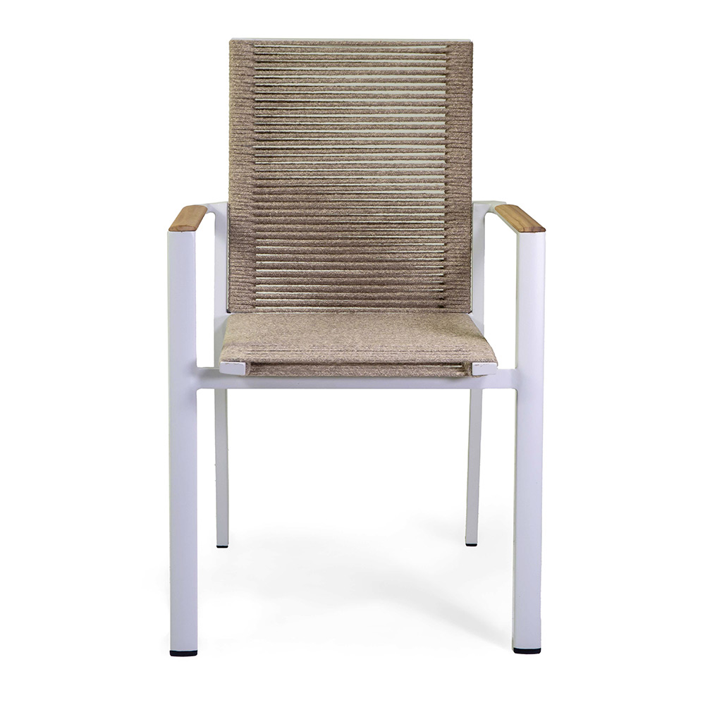 Odkryj nowoczesny urok i wygodę naszego krzesła ogrodowego. Dzięki eleganckiemu, współczesnemu wzornictwu krzesło to łączy w sobie wytrzymałość malowanego proszkowo aluminium z naturalnym pięknem lin. Drewniane podłokietniki dodają odrobinę ciepła i stylu.