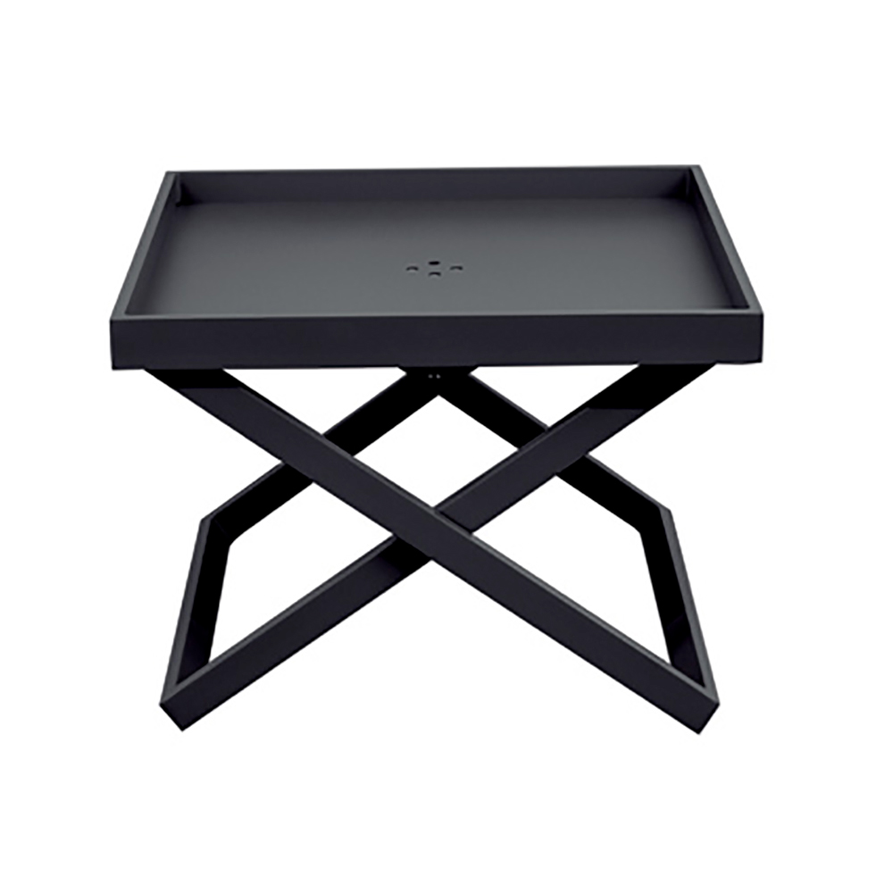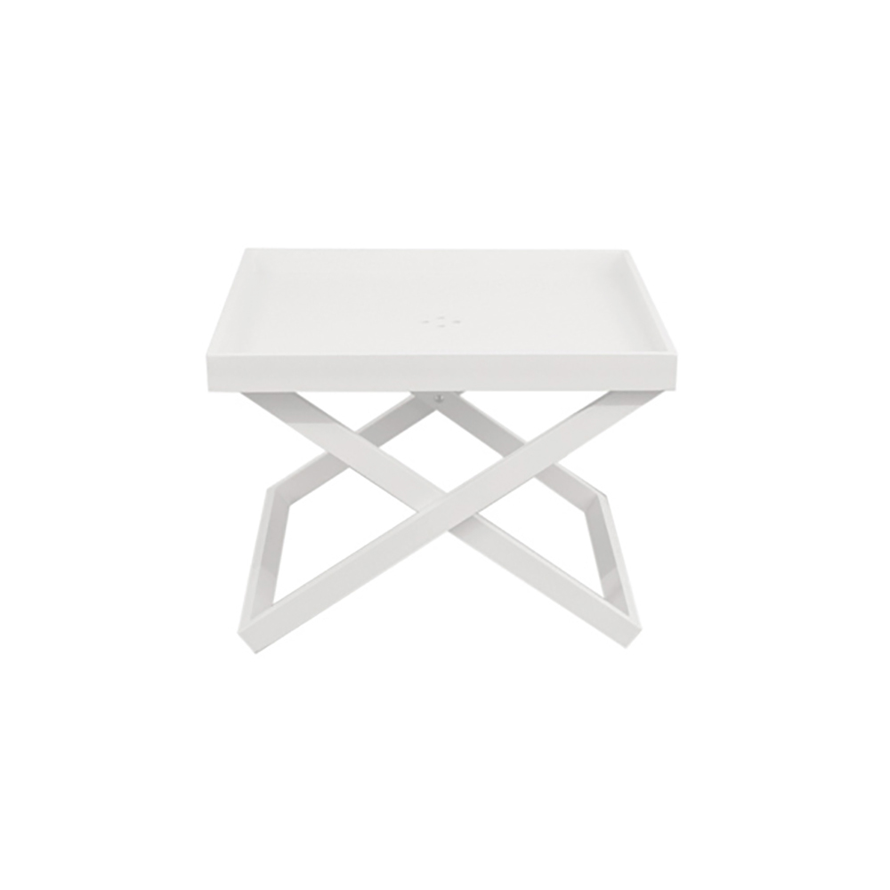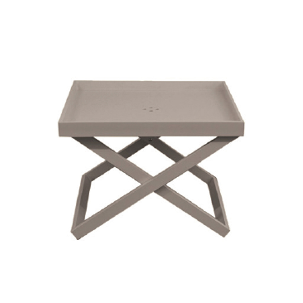 Kwadratowy stolik kawowy na zewnątrz z wyjmowaną tacą i aluminiową konstrukcją pokrytą proszkiem epoksydowym.