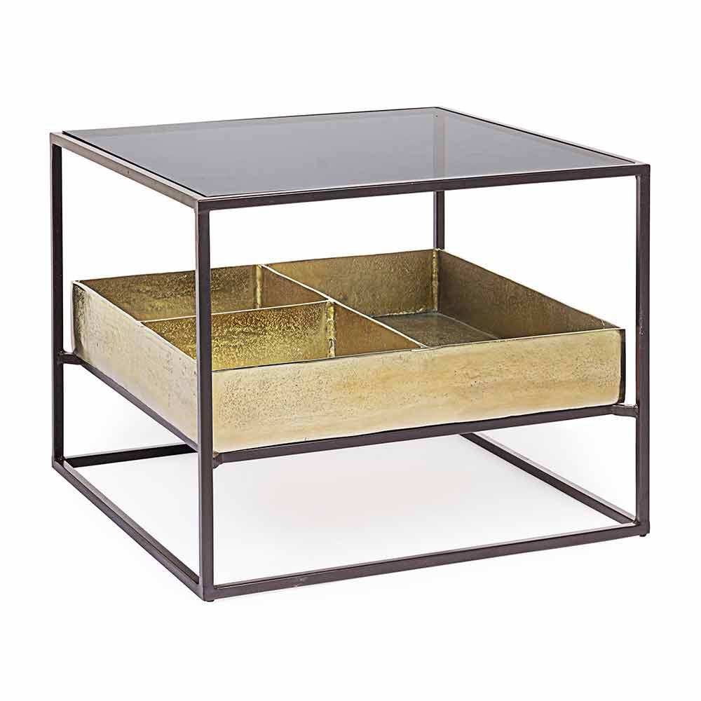 Stolik kawowy w stylu industrialnym ze szklanym blatem i stalową konstrukcją.