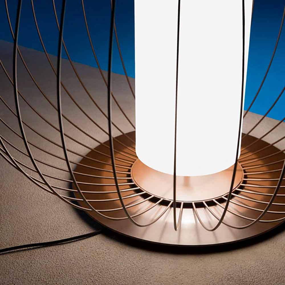 Ta oryginalna i wyjątkowa lampa stołowa ma projekt inspirowany latającymi latarniami na niebie, ponownie proponując swoją strukturę i ducha dzięki cienkim liniom, które przeciwstawiają się powietrzu wykonanemu z metalowego drutu, zapewniając minimalne uzupełnienie o silnym charakterze.