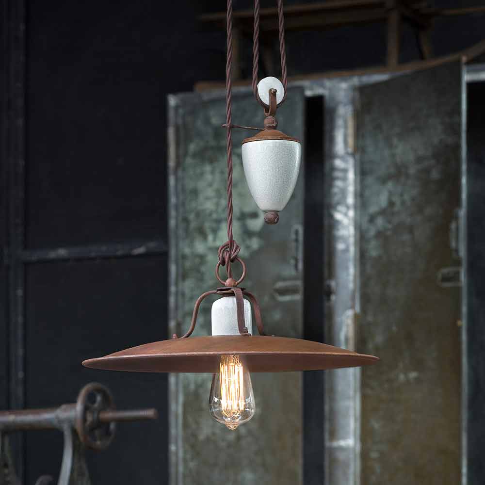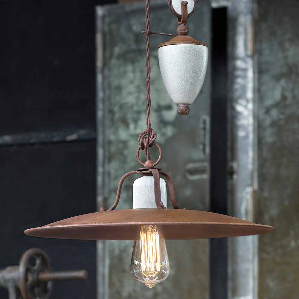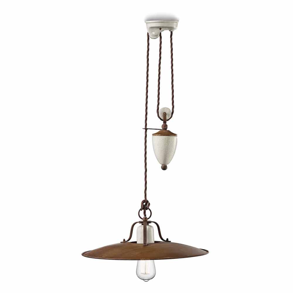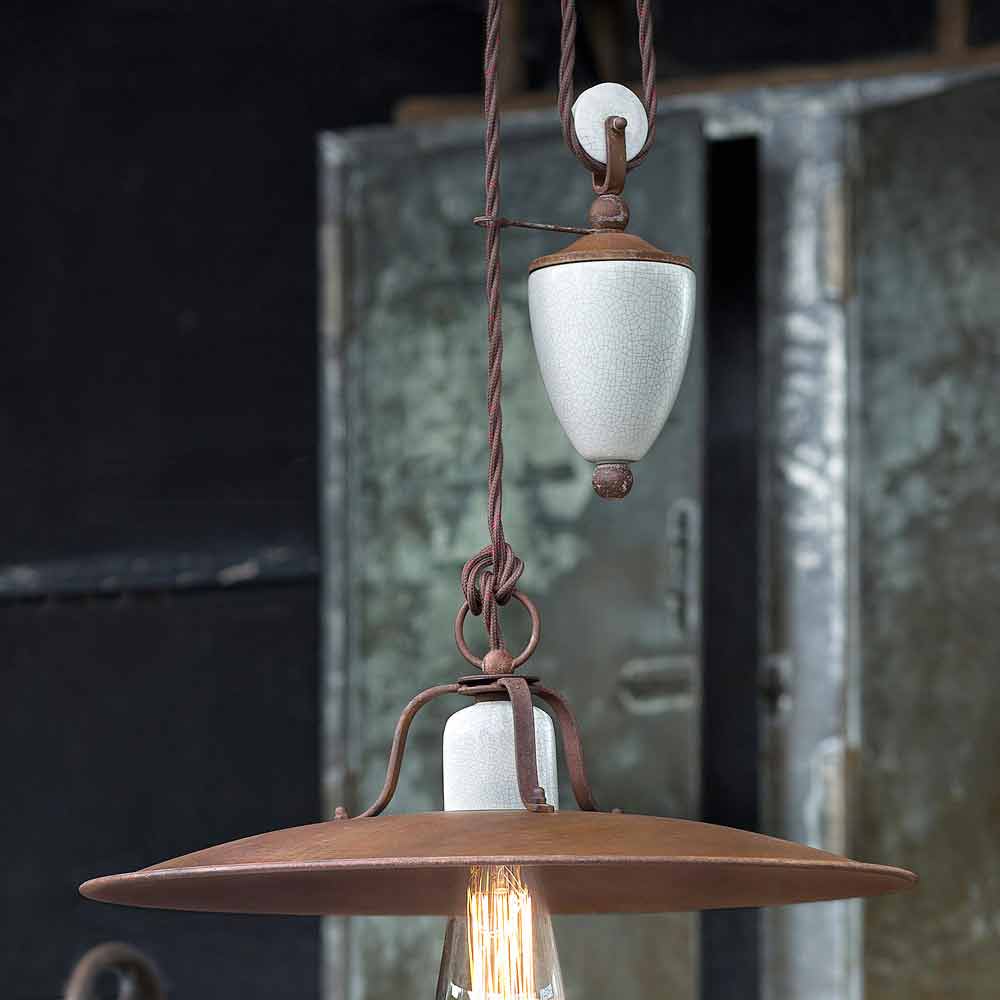 Ta piękna lampa składa się z dużej metalowej korony, wykończonej matowo rdzawym wykończeniem, wspartej na oplecionym kablu, który dopełnia jej industrialny styl i dzięki któremu można łatwo regulować jej wysokość, podczas gdy elementy ceramiczne, z których jest zbudowana, są poddane obróbce. z detalami craquelé, aby uzupełnić równowagę pełnych i pustych kształtów. To właśnie te materiały nadają Kristen rolę przywoływania przeszłości.