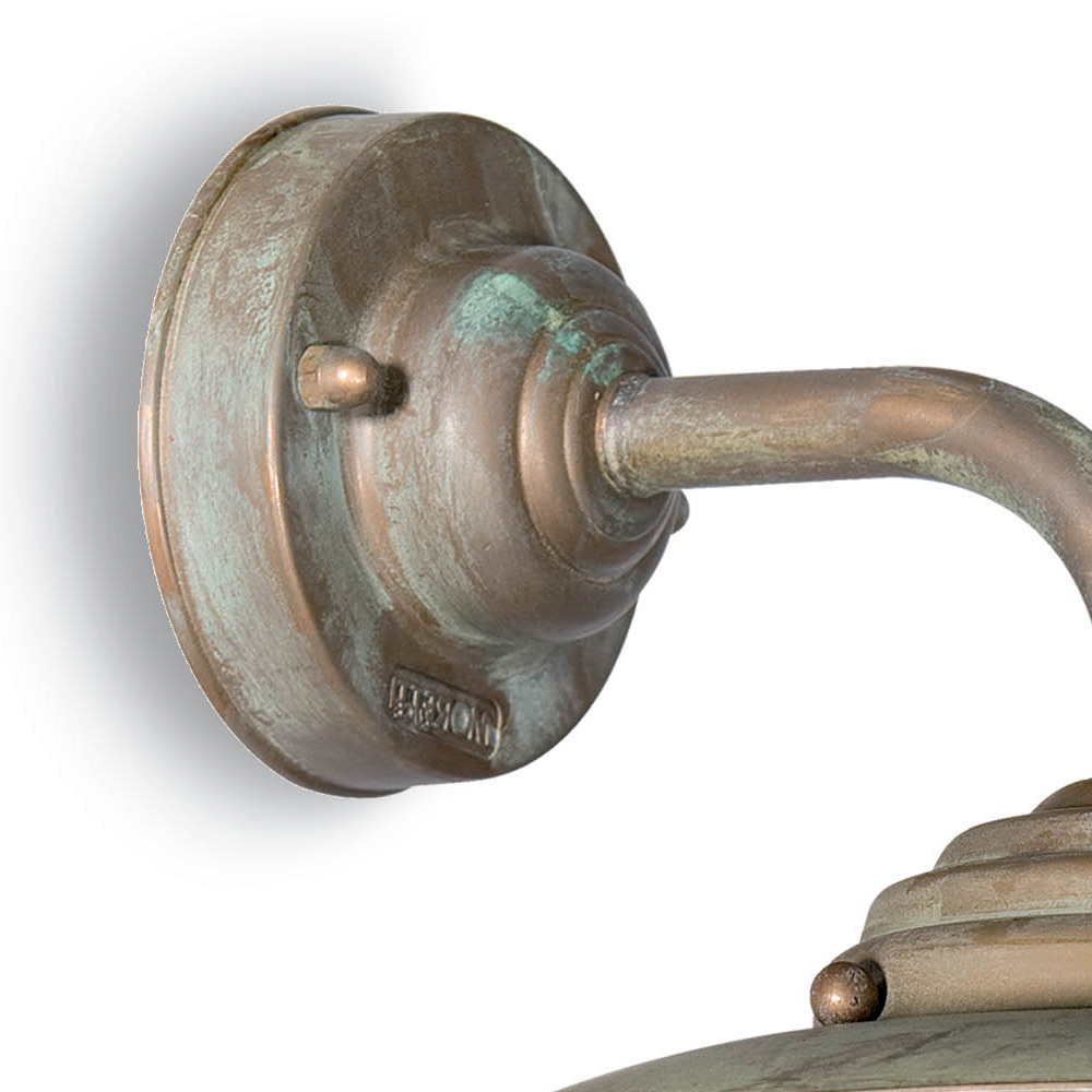 Autentyczna i ponadczasowa, ta zewnętrzna lampa ścienna przywołuje urok tradycyjnych lampionów, zinterpretowanych na nowo z elegancką nutą. Ręcznie wykonana mosiężna konstrukcja wyróżnia się antycznym wykończeniem , które podkreśla materialność metalu i nadaje mu wyrafinowany, zachowany wygląd.