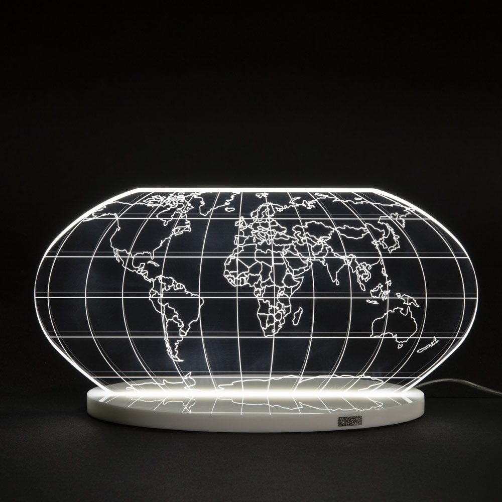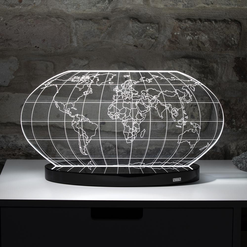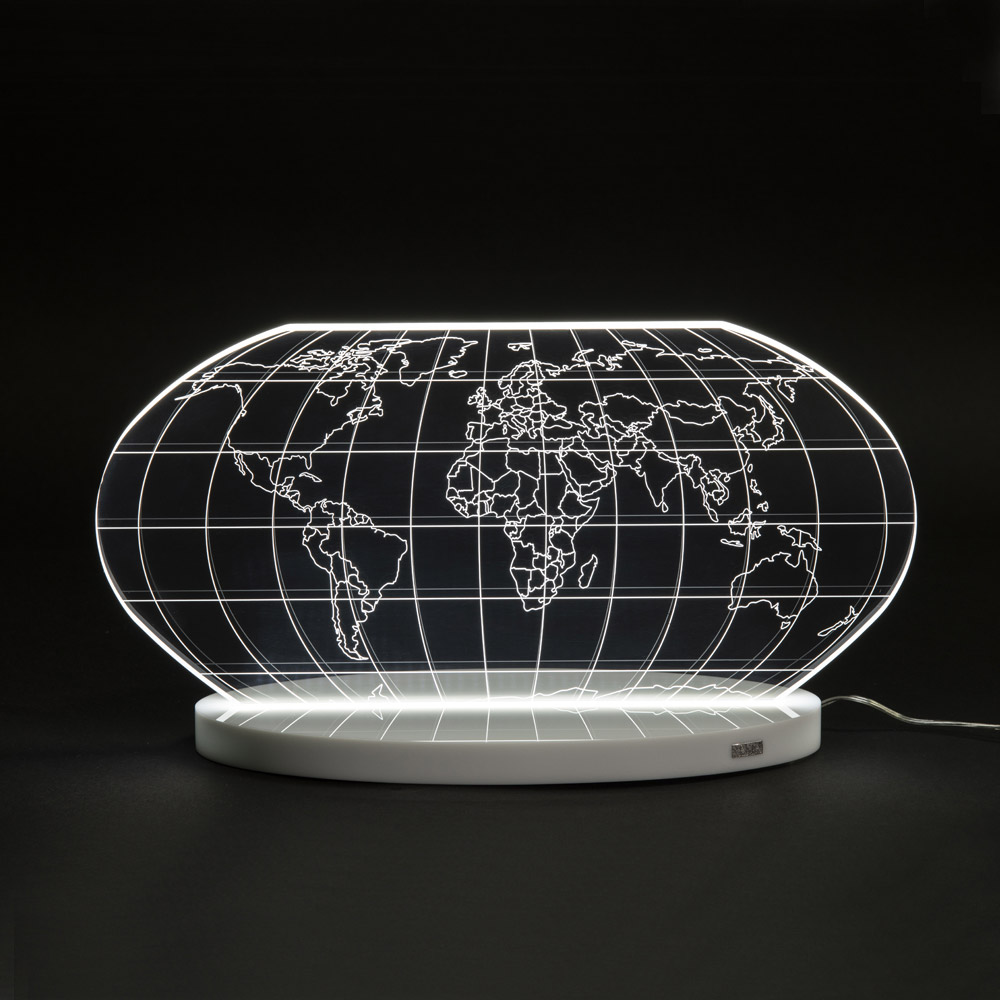 Lampa stołowa z przezroczystego kryształu akrylowego i grawerowana laserowo mapa świata, 2 rozmiary, wyprodukowana we Włoszech.