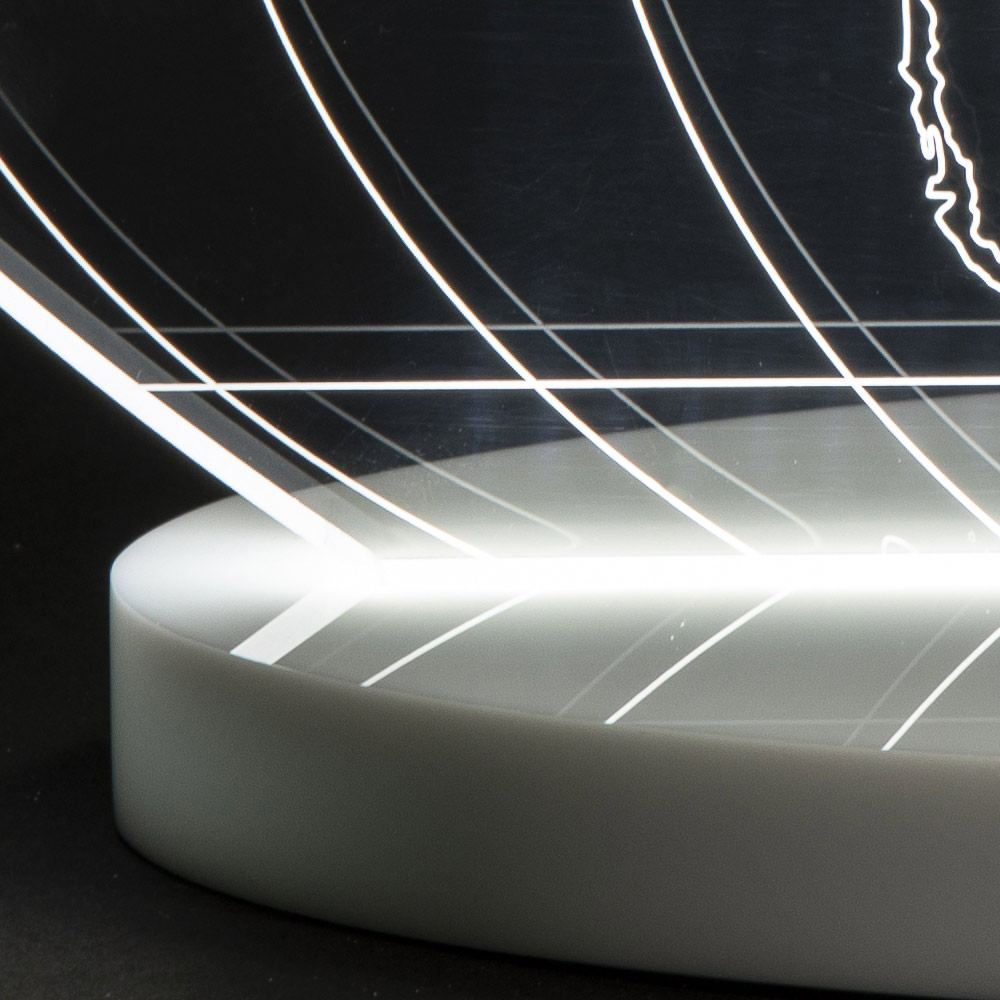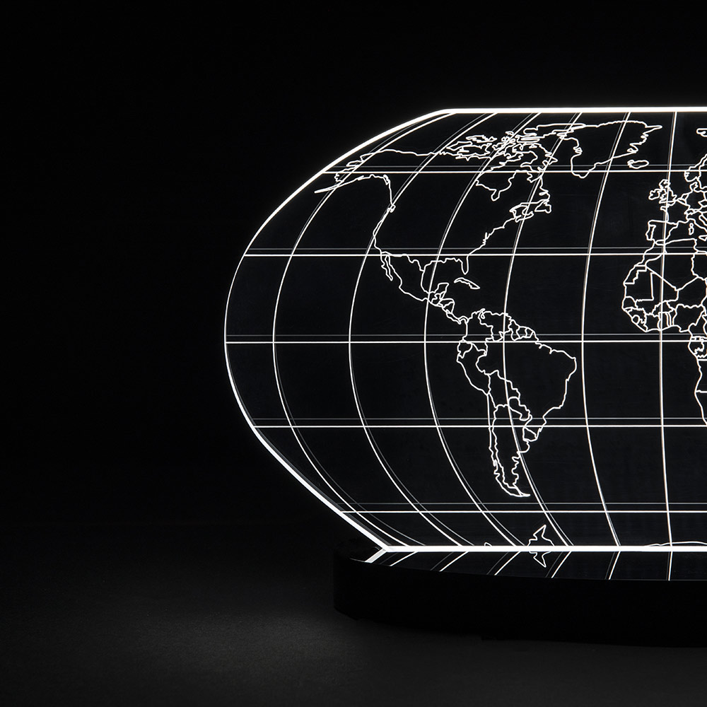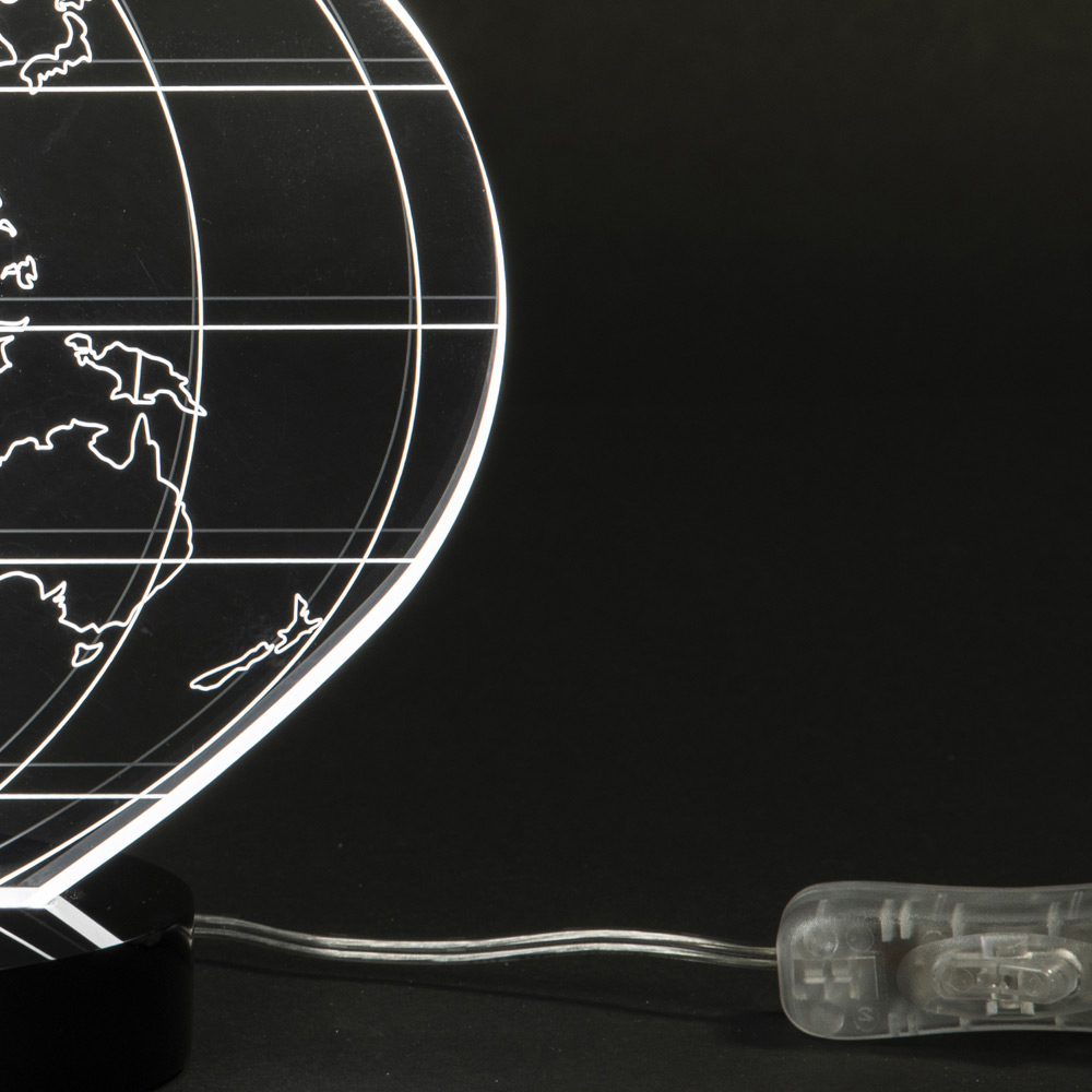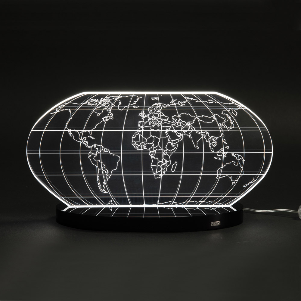 Lampa stołowa z przezroczystego kryształu akrylowego i grawerowana laserowo mapa świata, 2 rozmiary, wyprodukowana we Włoszech.