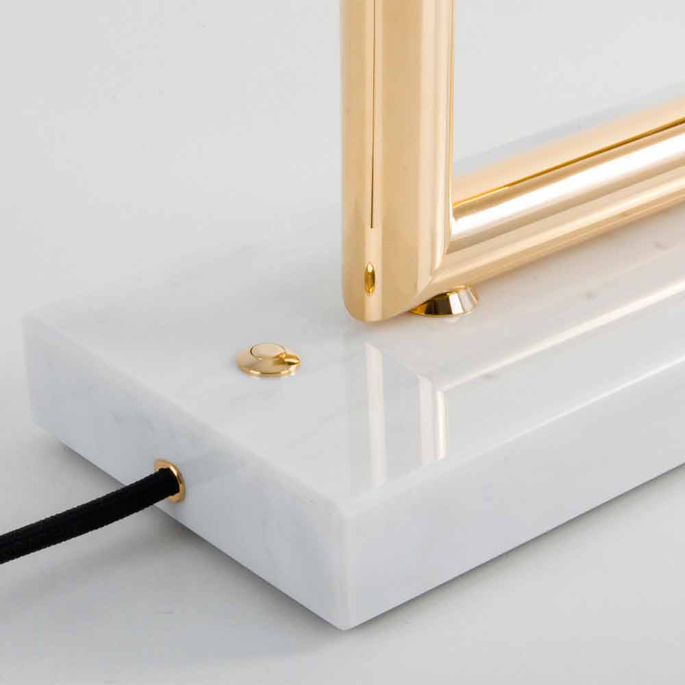 Lampa stołowa wykonana we Włoszech z polerowaną mosiężną konstrukcją, dyfuzorem z żywicy akrylowej i marmurową podstawą wraz z kablem elektrycznym z czarnej tkaniny, przyciskiem zasilania z regulatorem natężenia światła i zintegrowanymi źródłami LED.