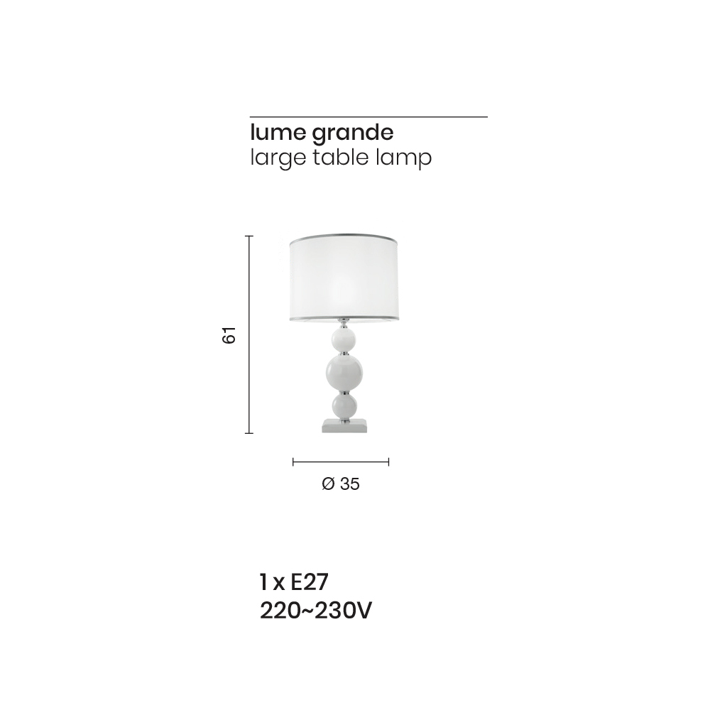 Idealny dla tych, którzy chcą oświetlenia scenograficznego w staroświeckim stylu, jego luksusowy design składa się z ręcznie wykonanej szklanej podstawy z trzema szklanymi kulami umieszczonymi jedna nad drugą, aby podeprzeć okrągły abażur z tkaniny. Rdzeń i detale z chromowanego metalu.