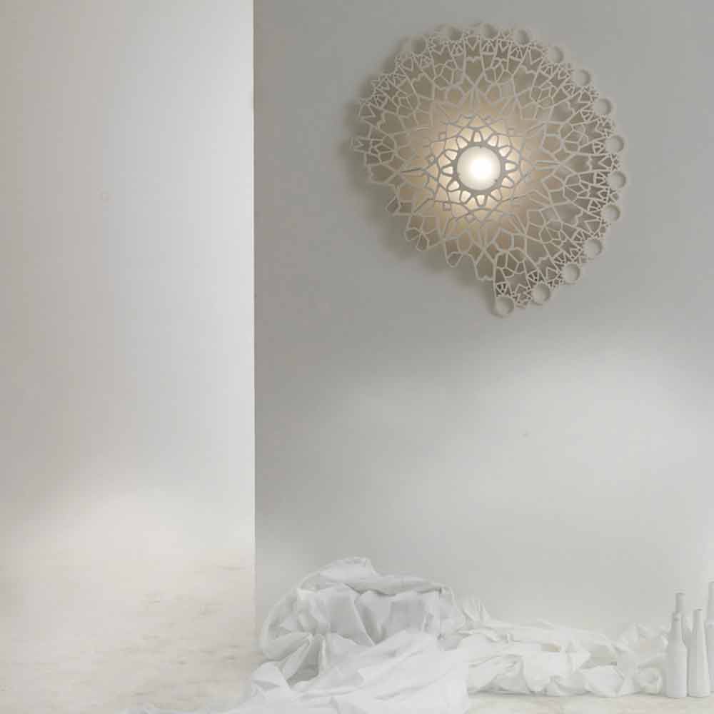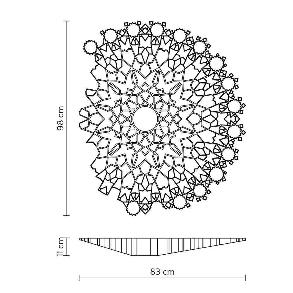 Ta oryginalna i jedyna w swoim rodzaju lampa sufitowa lub ścienna przywołuje urok naturalnego światła, które promieniuje między zdobionymi rozetami gotyckich katedr, tworząc sugestywną i emocjonalną atmosferę.
