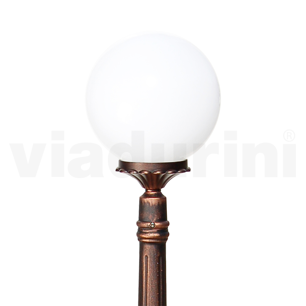 Lampa ogrodowa wykonana z odlewanej ciśnieniowo aluminiowej konstrukcji i opalowego akrylowego klosza w kształcie kuli, w całości wyprodukowana we Włoszech.