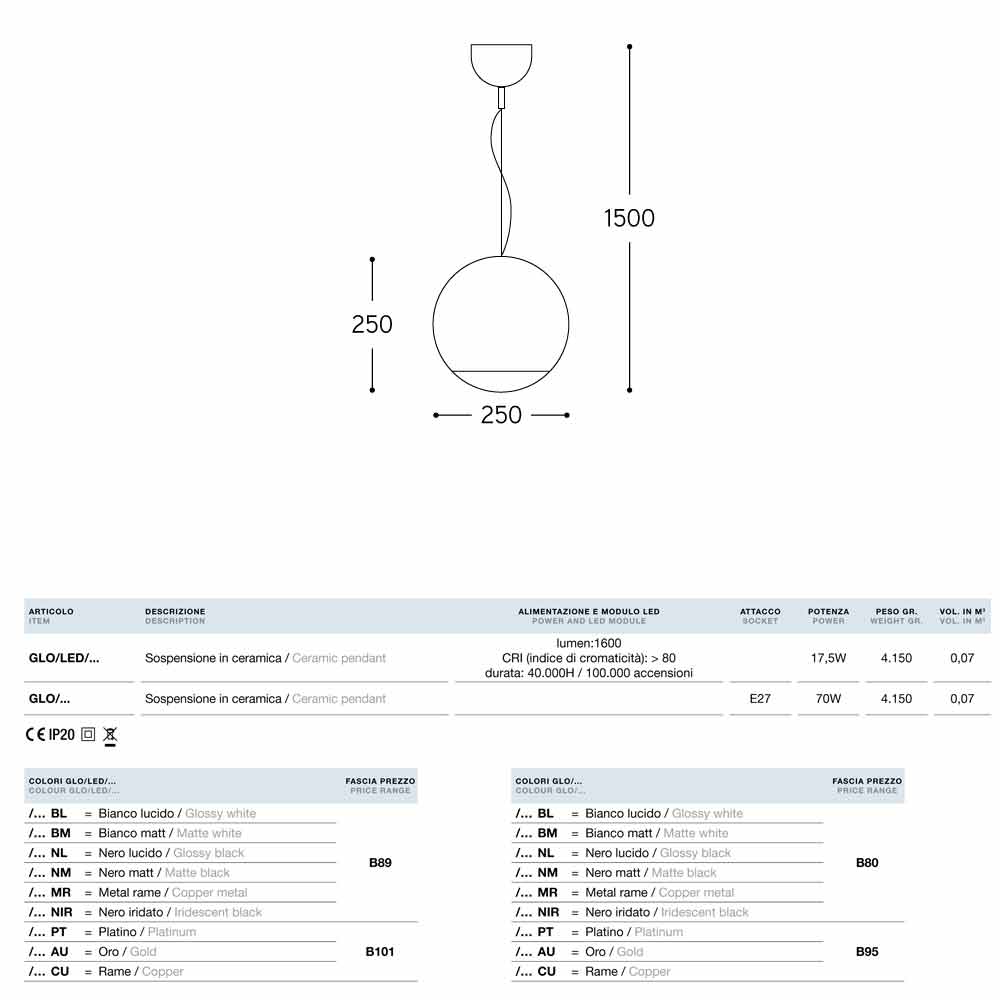 Designerska ceramiczna lampa wisząca Globo firmy Aldo Bernardi , dostępna z oprawką na żarówkę standardową E27 lub z diodą LED.