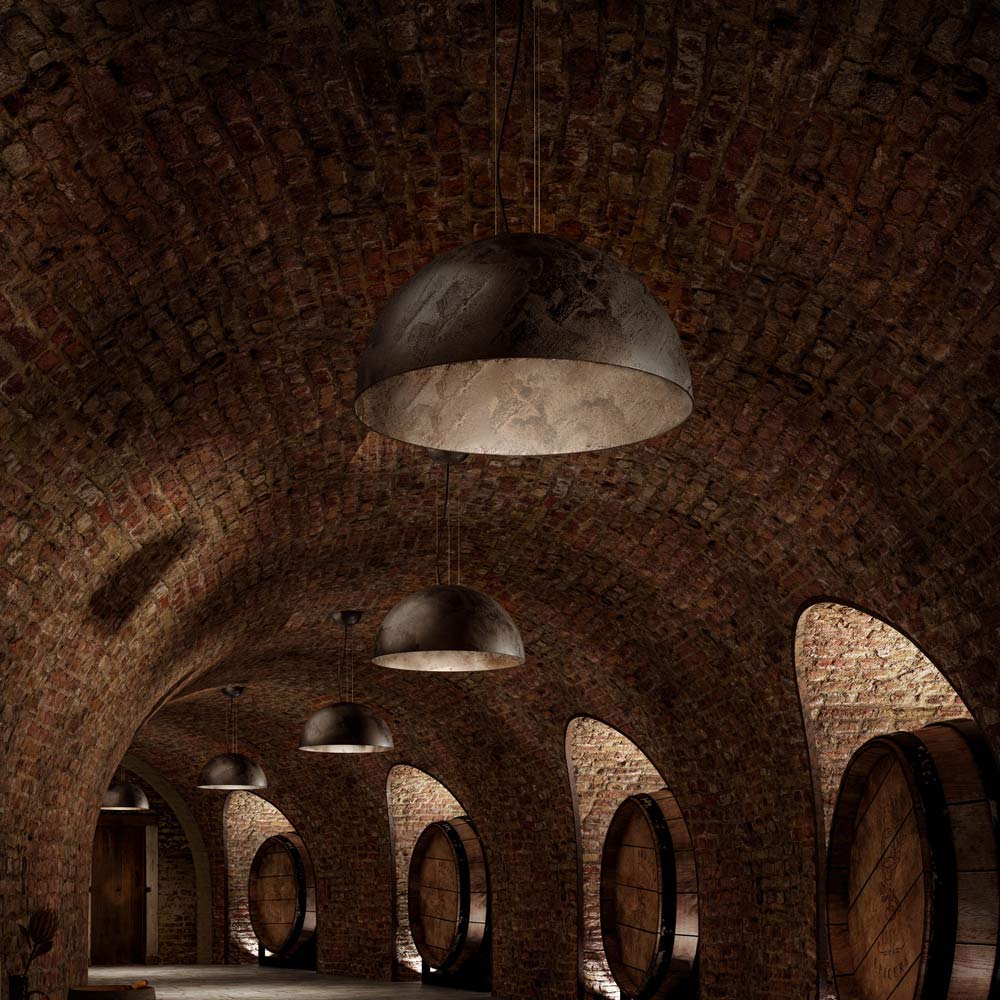 Idealne pół koła charakteryzują tę kolekcję lamp, które zostały zaprojektowane jako hołd dla rewolucji astronomicznej. Kontrast pomiędzy zewnętrznym mosiądzem lub żelaznym wnętrzem wykonane z płatkami złota, srebra lub miedzi, daje temu produktowi estetykę wielkiego efektu wizualnego. Dostępny z zewnętrzną częścią z mosiądzu lub żelaza o średnicach 30,40,60 cm oraz zewnętrzną częścią z żelaza o średnicy 80 cm.