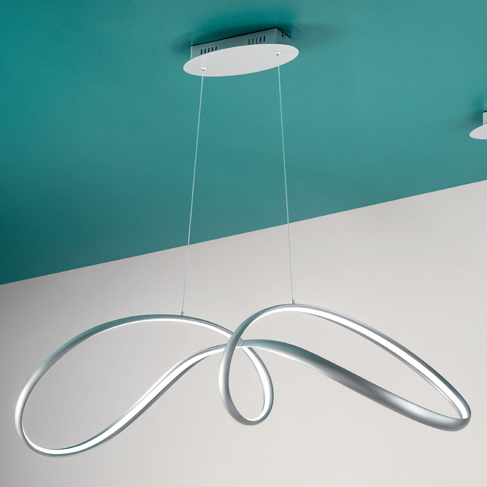 Lampa wisząca LED ze srebrnego metalu i polimeru, nowoczesny design w dwóch wymiarach.