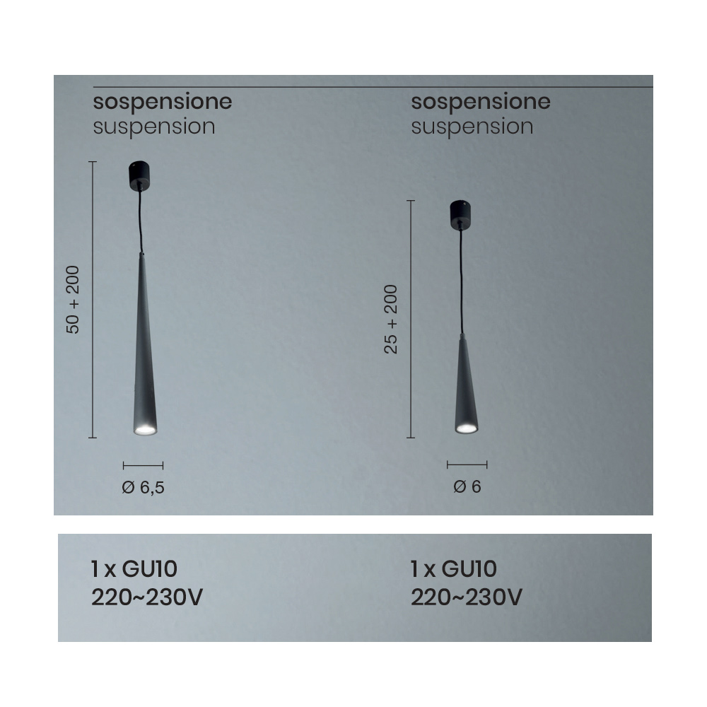 czysty, prosty i minimalistyczny design. Dostępne wykończenia: Dostępne rozmiary:- średnica: 6,5 x H max 250 cm