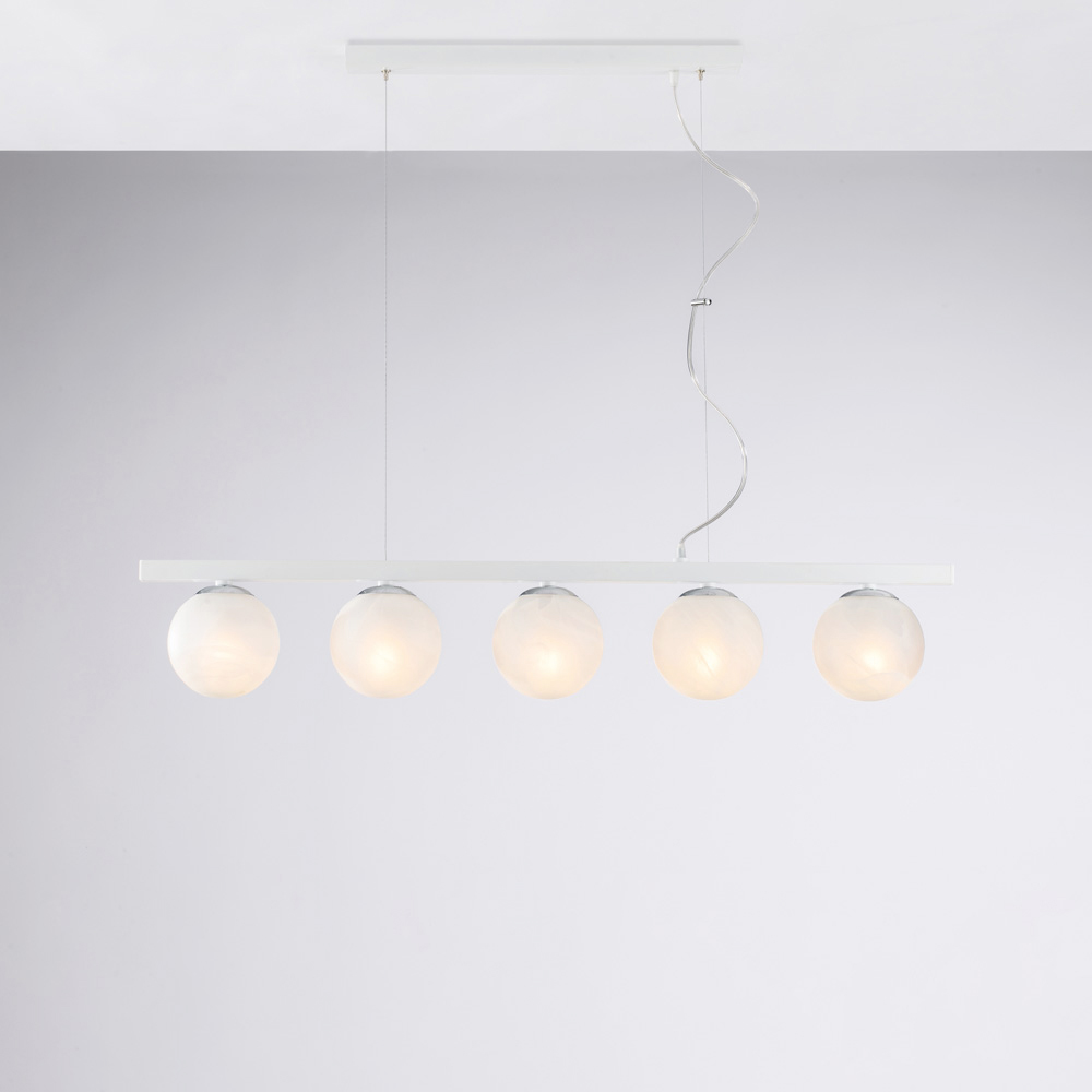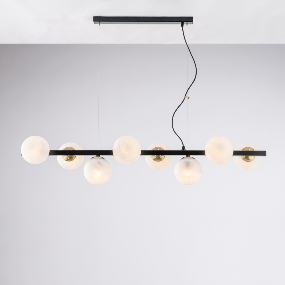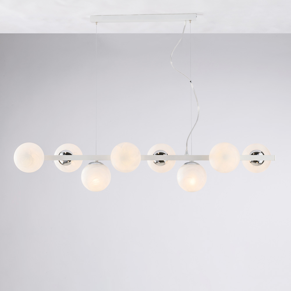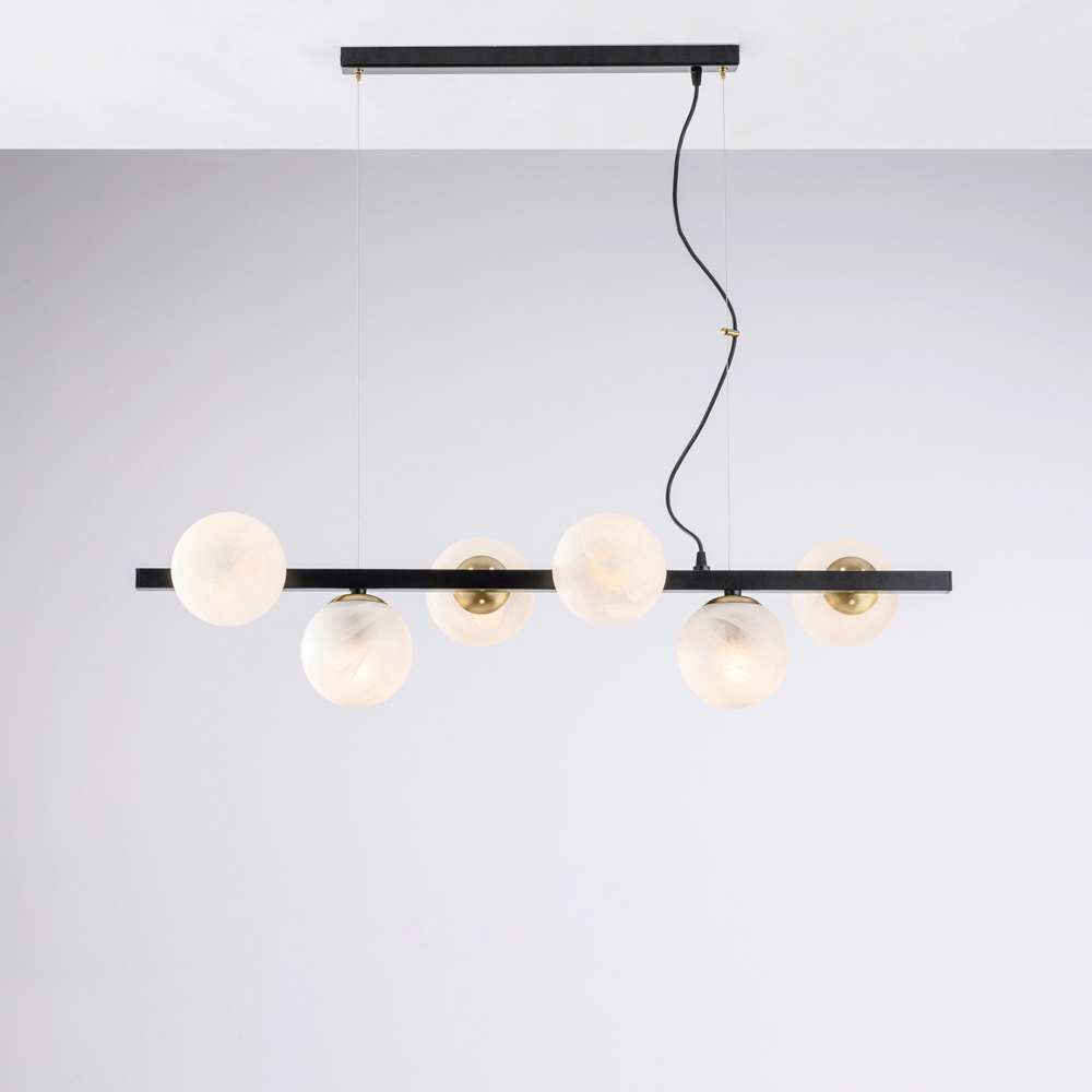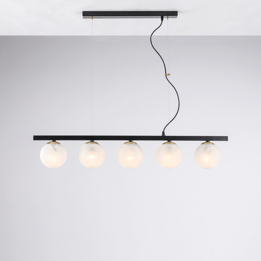 Nowoczesna, elegancka i efektowna, ta ręcznie wykonana lampa wisząca z żelaza została zaprojektowana, aby wzbogacić nowoczesne wnętrza rozproszonym, efektownym światłem. Liniowa struktura, wzbogacona sekwencyjnymi kulami świetlnymi , tworzy idealną równowagę między geometryczną surowością a wizualną miękkością.