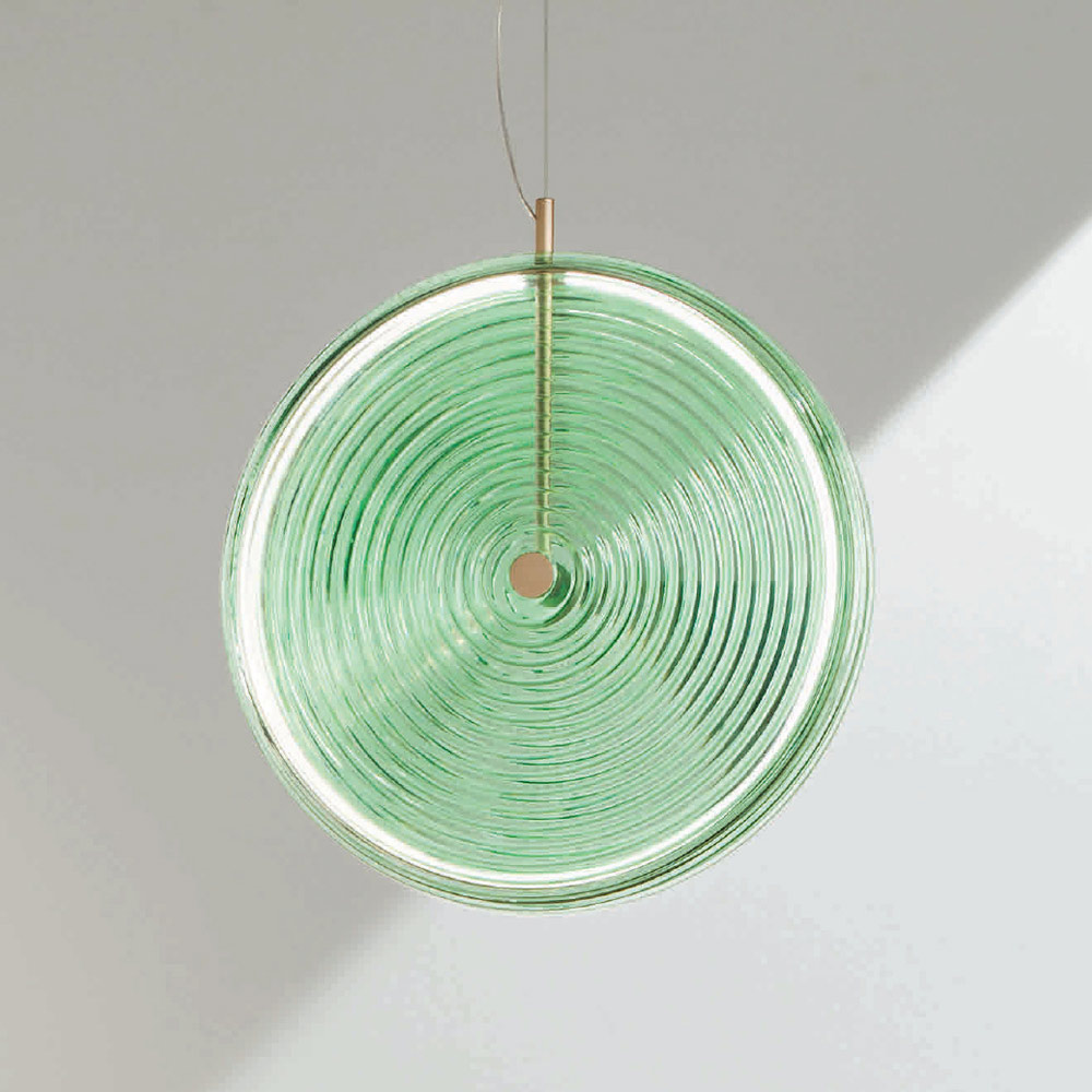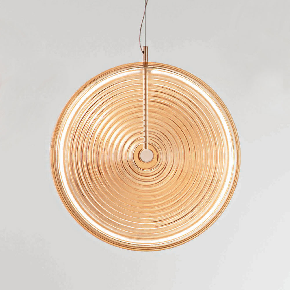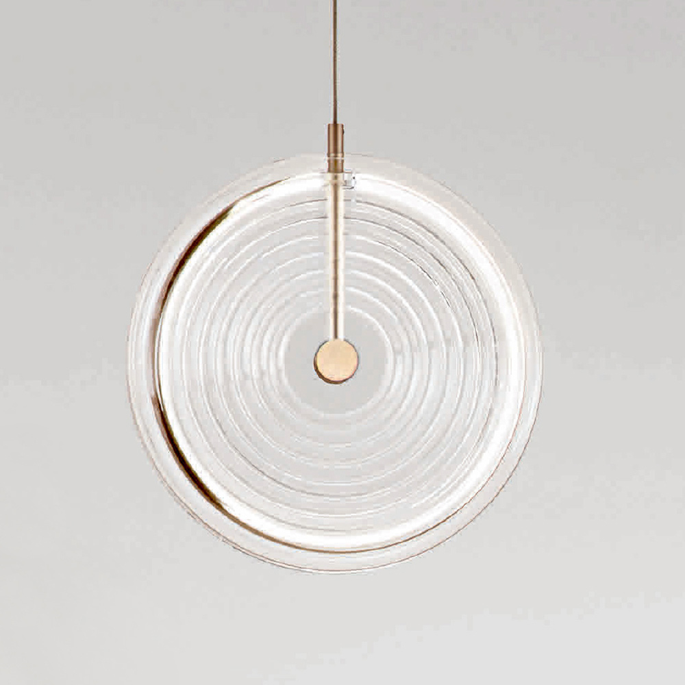 metalu malowanego na złoty kolor, szkła ozdobionego koncentrycznymi liniami ze światłem LED i