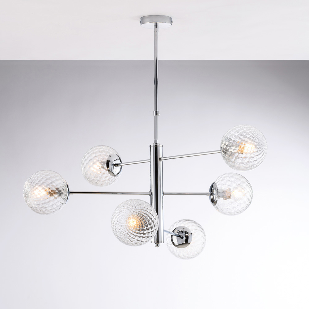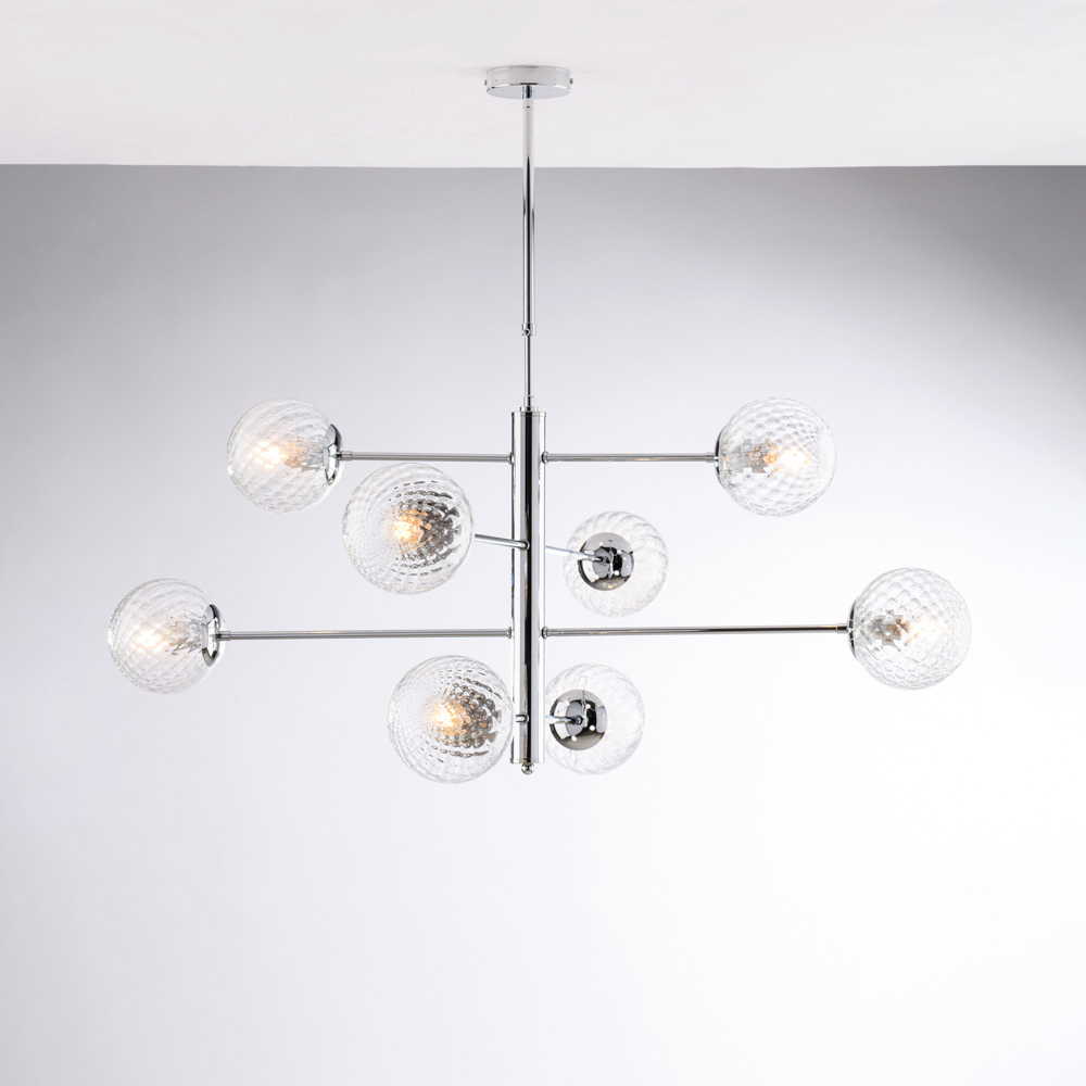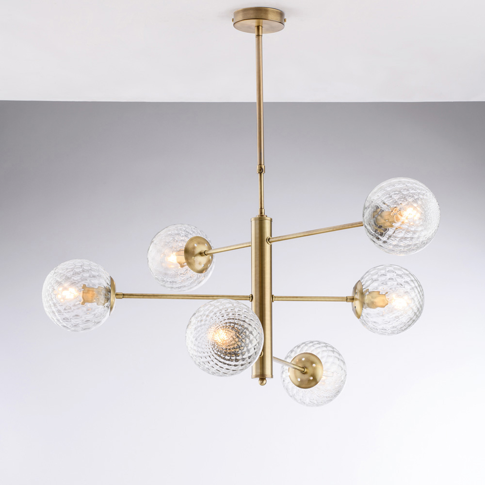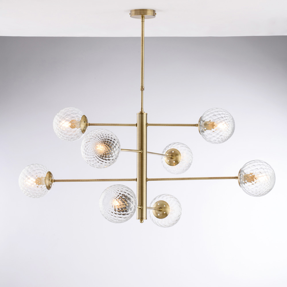 Elegancka i nowoczesna, ta ręcznie wykonana, żelazna lampa wisząca wyróżnia się zrównoważoną, geometryczną kompozycją. Poziome ramiona podtrzymują kuliste szklane dyfuzory, tworząc wyrafinowaną grę symetrii, która rzuca rozproszone, harmonijne światło.