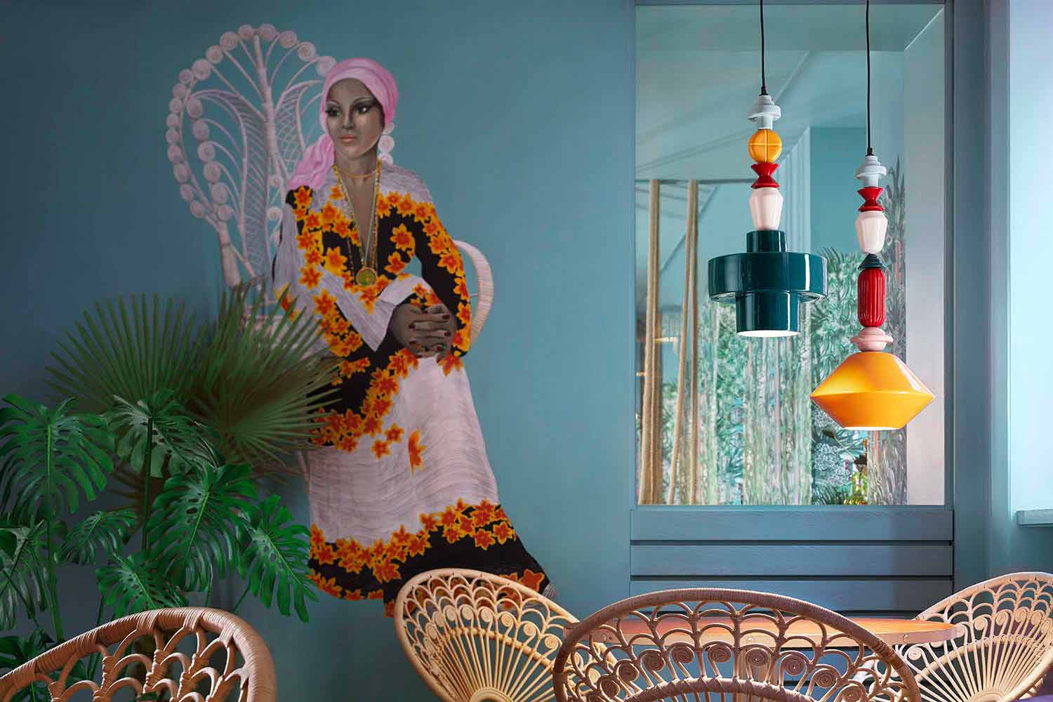 Lariat jest ozdobiony wielokolorowymi elementami ceramicznymi, które następują po sobie pionowo aż do centralnego geometrycznego dyfuzora.