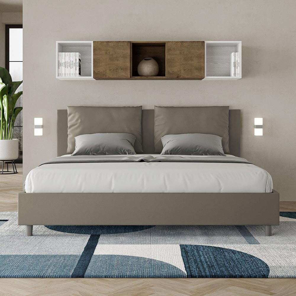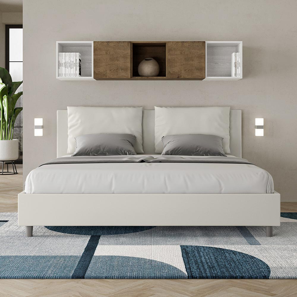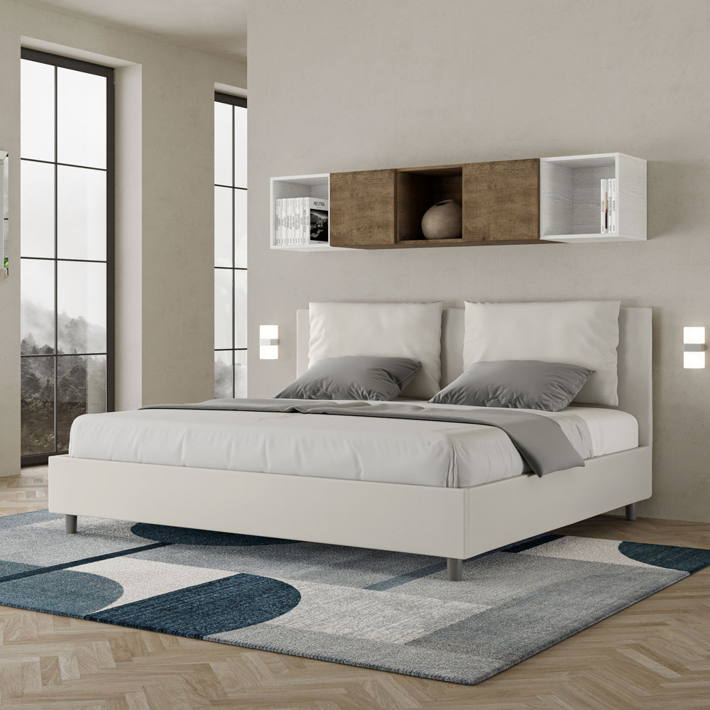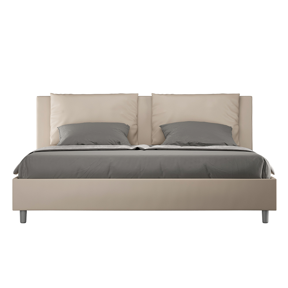 Łóżko king size 180x200 cm, wyściełane panelami melaminowymi i pokryte sztuczną skórą , w całości wyprodukowane we Włoszech. To łóżko king-size z tapicerowaną ramą doskonale ucieleśnia zalety łóżka tapicerowanego: komfort, nowoczesny styl, funkcjonalność i efektywne wykorzystanie przestrzeni . To łóżko, z hojnie wyściełanym zagłówkiem , oferuje relaksujący kącik idealny do czytania lub oglądania telewizji, upiększając Twoją sypialnię. Eleganckie i stylowe, łóżko jest obite sztuczną skórą, dzięki czemu czyszczenie jest szybkie i łatwe: wystarczy przetrzeć je ściereczką z mikrofibry, aby lśniło czystością.