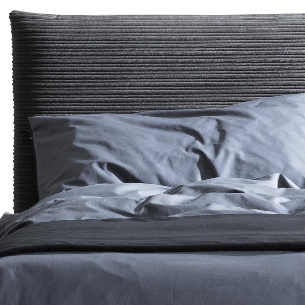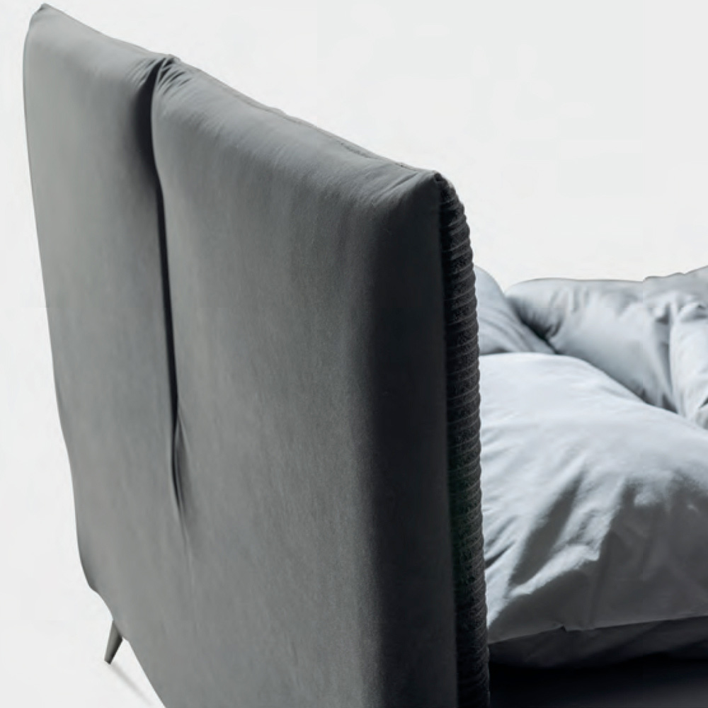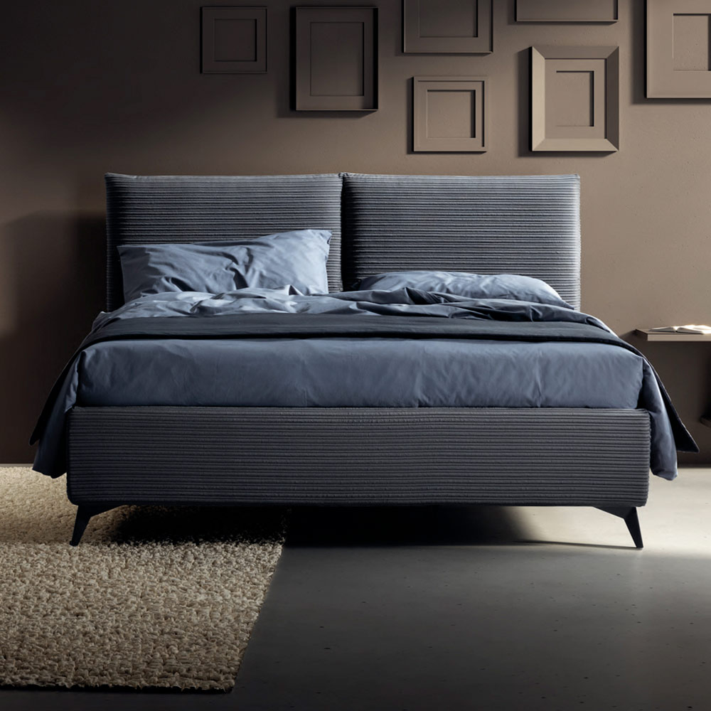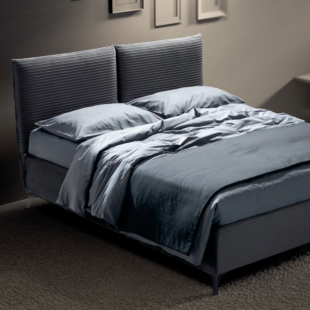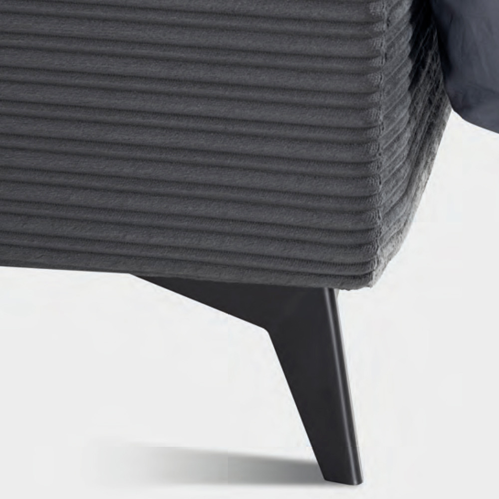 pojemnikiem do przechowywania, metalowymi nóżkami w kolorze antracytowym (wysokość 13,5 cm) i miękkim wezgłowiem uzyskanym dzięki specjalnemu wypełnieniu w kształcie poduszki; centralny podział wezgłowia nadaje mu szczególnie czystą i przyjemną linię o oryginalnym efekcie estetycznym.