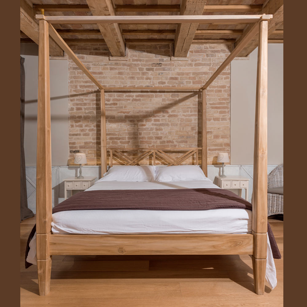 To łóżko z baldachimem z litego drewna tekowego to uroczy mebel, który potrafi przekształcić sypialnię w wyrafinowaną i pełną emocji przestrzeń. Solidna konstrukcja i kunszt wykonania podkreślają naturalny rysunek drewna , tworząc ciepłą i elegancką atmosferę o ponadczasowym charakterze.