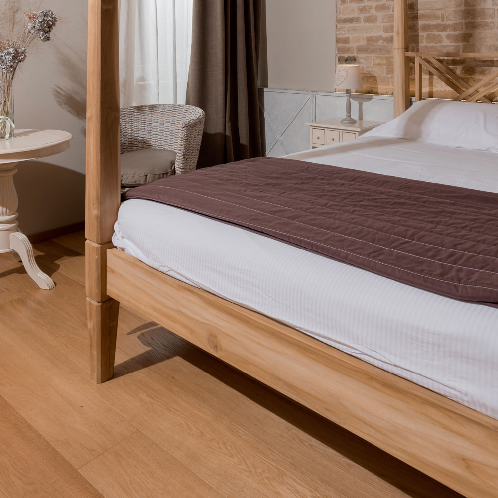 To łóżko z baldachimem z litego drewna tekowego to uroczy mebel, który potrafi przekształcić sypialnię w wyrafinowaną i pełną emocji przestrzeń. Solidna konstrukcja i kunszt wykonania podkreślają naturalny rysunek drewna , tworząc ciepłą i elegancką atmosferę o ponadczasowym charakterze.