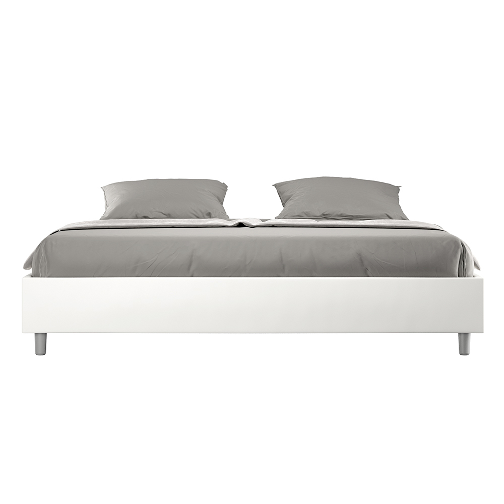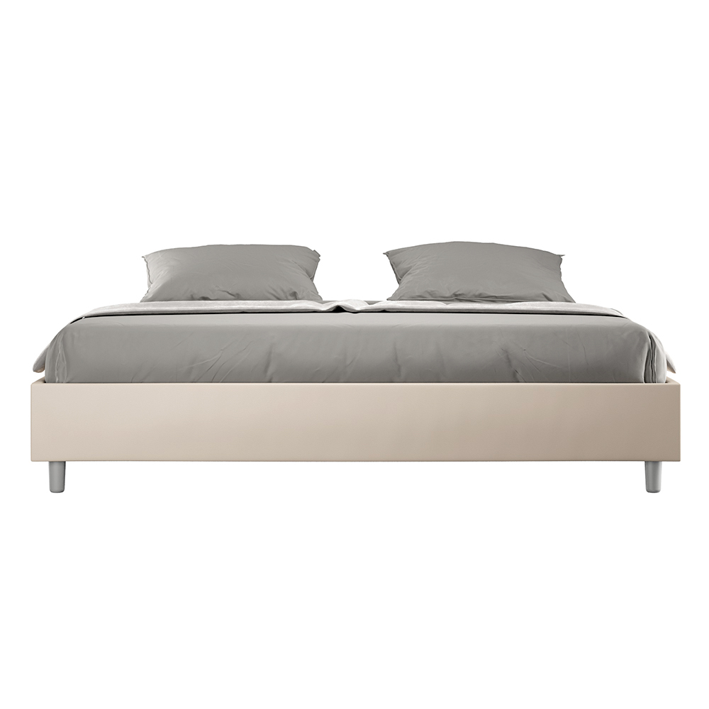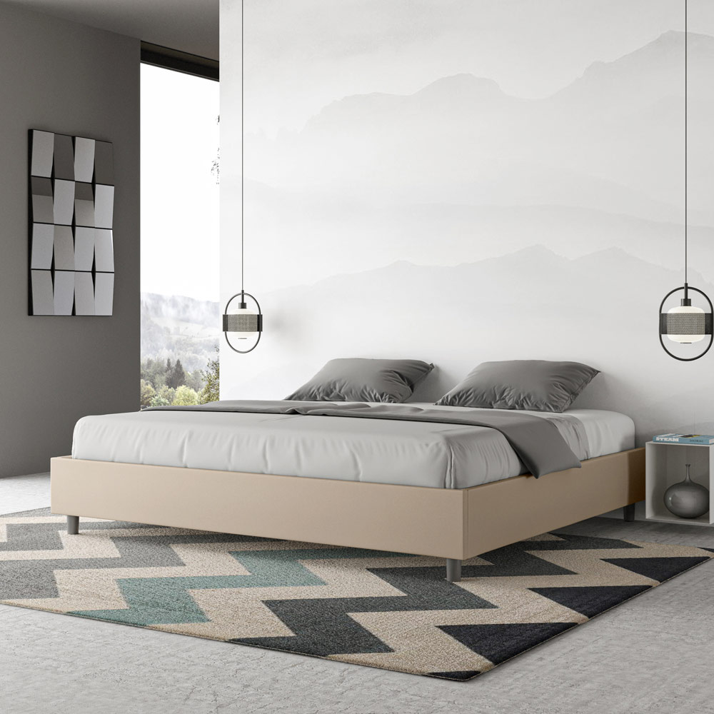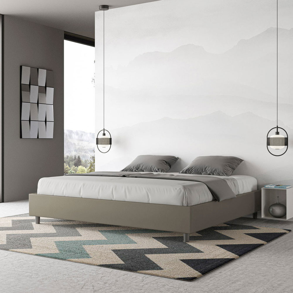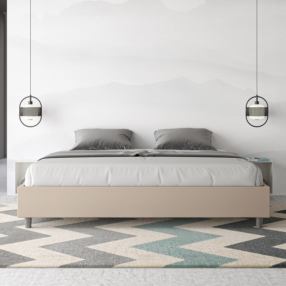 Łóżko typu super king size o wymiarach 200x200 cm, wyściełane panelami melaminowymi i pokryte sztuczną skórą , w całości wyprodukowane we Włoszech. To łóżko typu super king-size wyróżnia się czystym, minimalistycznym wzornictwem . Jego stonowana estetyka i wszechstronność sprawiają, że z łatwością wpasuje się w każde otoczenie. Jedną z jego charakterystycznych cech jest brak tradycyjnego zagłówka , dzięki czemu idealnie nadaje się do ustawienia w nietypowych przestrzeniach, takich jak pod oknem, na strychu czy w pobliżu dekoracyjnej ściany, bez zasłaniania widoku i uzyskiwania pożądanego efektu.