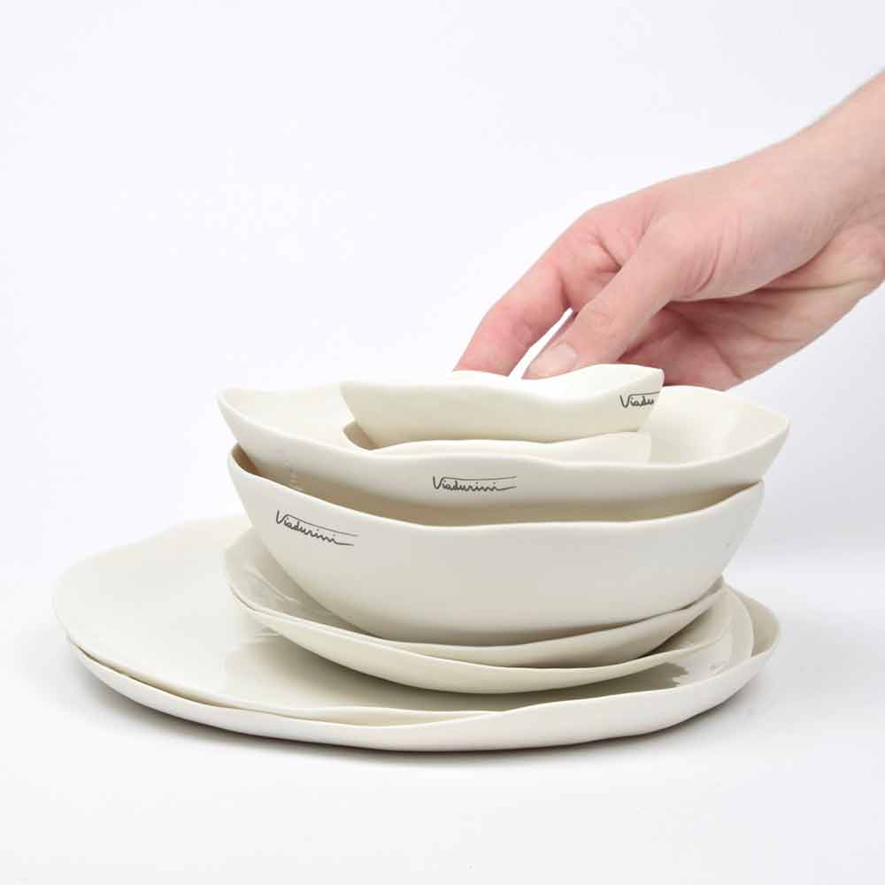 Tym, co charakteryzuje tę usługę, czyniąc ją wyjątkową, jest organiczny i naturalny design, który pozostawia swobodę ekspresji materiałowi: w ten sposób znajdujemy krzywą krawędź, a nie ruch spowodowany deformacją gliny podczas gotowania, która staje się charakterystycznym i cennym elementem produktu. .