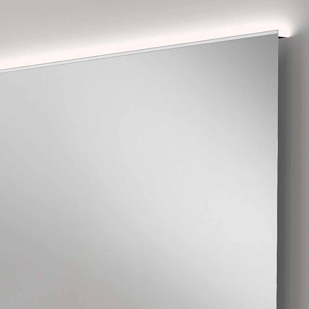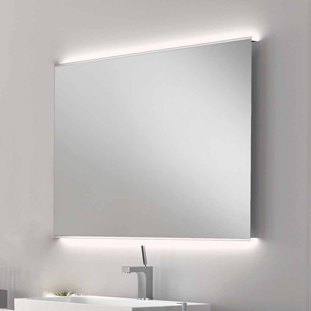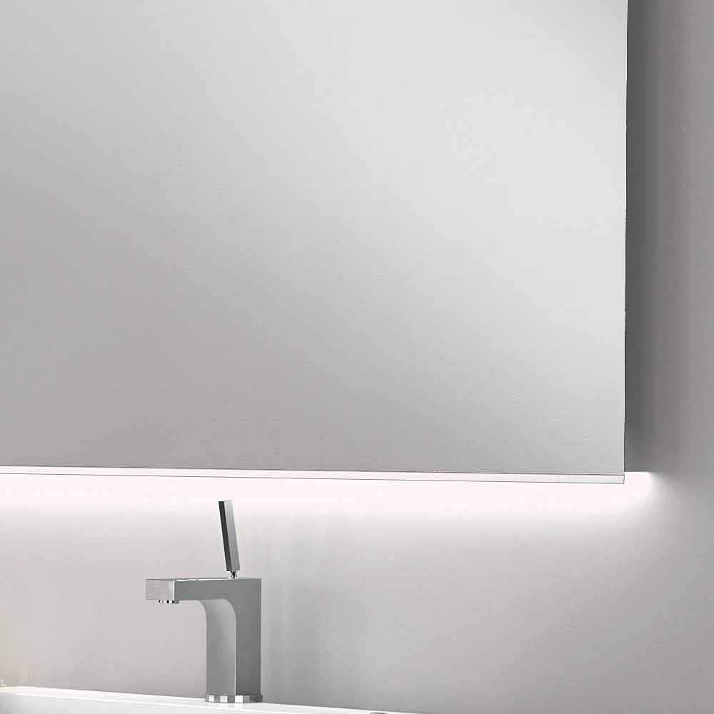 Minimalistyczne lustro z lekkim piaskowaniem na górnej i dolnej krawędzi dla optymalnego oświetlenia otoczenia.