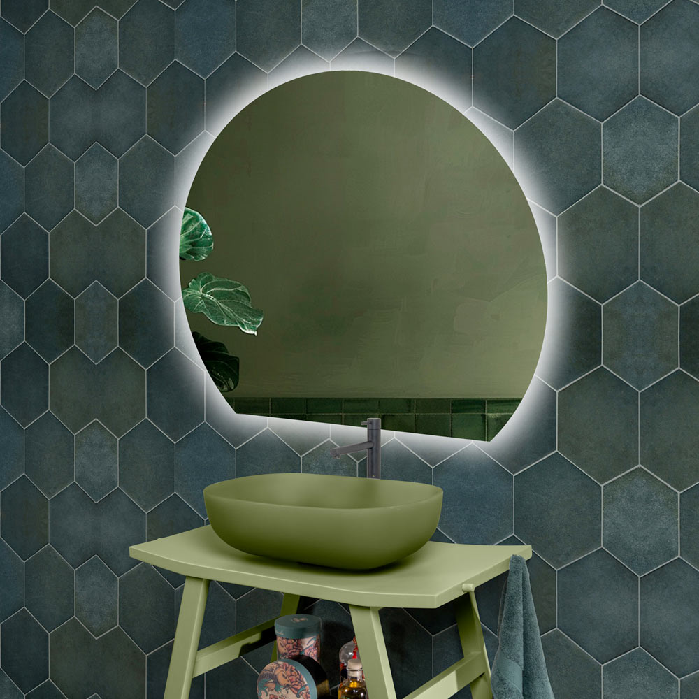 Zintegrowane oświetlenie LED , równomiernie rozłożone na obwodzie, tworzy delikatny efekt, który podkreśla czystość okrągłego kształtu i przyczynia się do stworzenia przyjaznej i eleganckiej atmosfery. Idealne do pielęgnacji ciała, zapewnia funkcjonalne, a jednocześnie sugestywne oświetlenie.