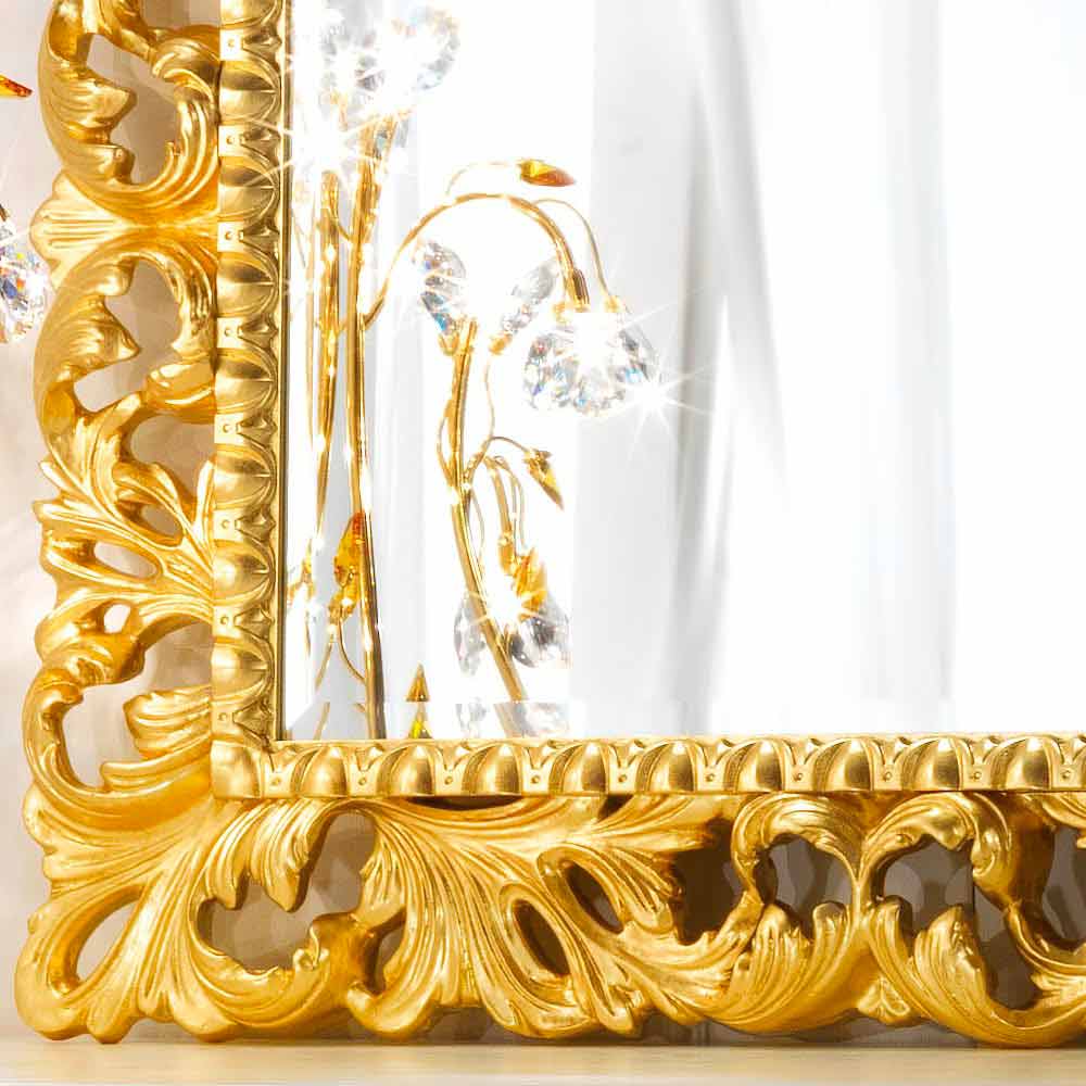 Rama wykonana jest z drewna ozdobionego dekoracjami. Lustro w szlifowanym krysztale o grubości 4 mm.