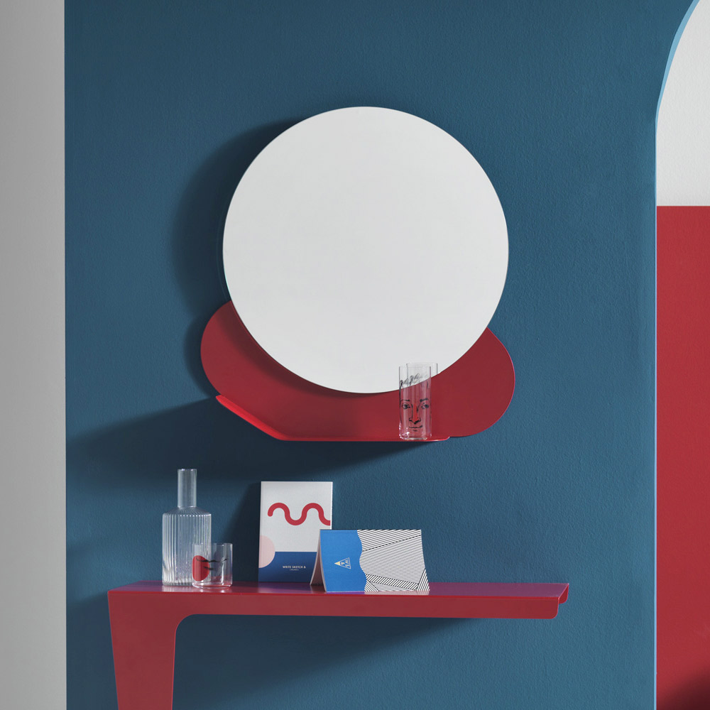To nowoczesne designerskie lustro ścienne wpasowuje się w młode konteksty dzięki dolnej półce z kolorowego metalu o żywych i współczesnych kolorach, które wyznaczają okrągłe kształty lustra i tworzą ciągłość z otaczającym środowiskiem. Praktyczny i funkcjonalny produkt o oryginalnym i mieniącym się designie, który potrafi scharakteryzować różne konteksty, od wejścia do salonu, po łazienkę czy sypialnię.