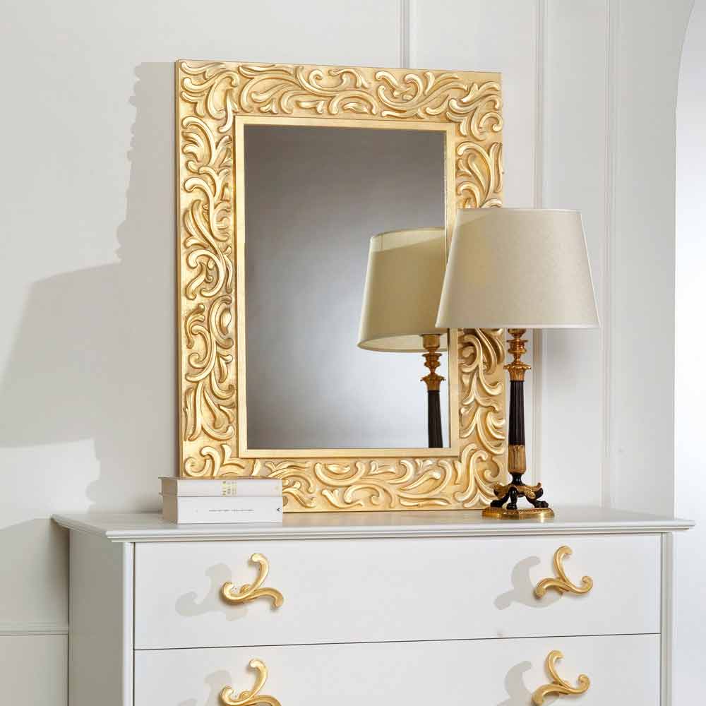 Rama wykonana jest z drewna z zastosowaniem żywicy. Koronkowe wykończenie złotem.. Lustro w szlifowanym krysztale o grubości 4 mm.