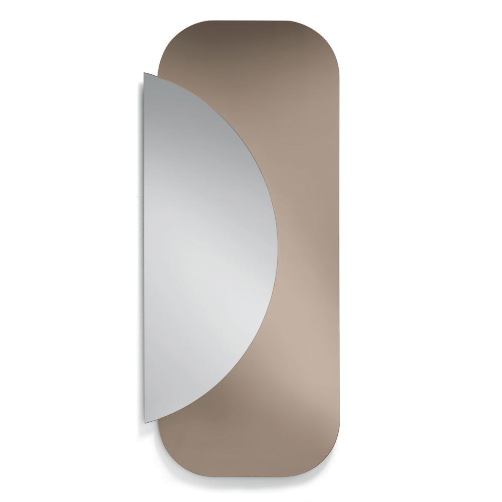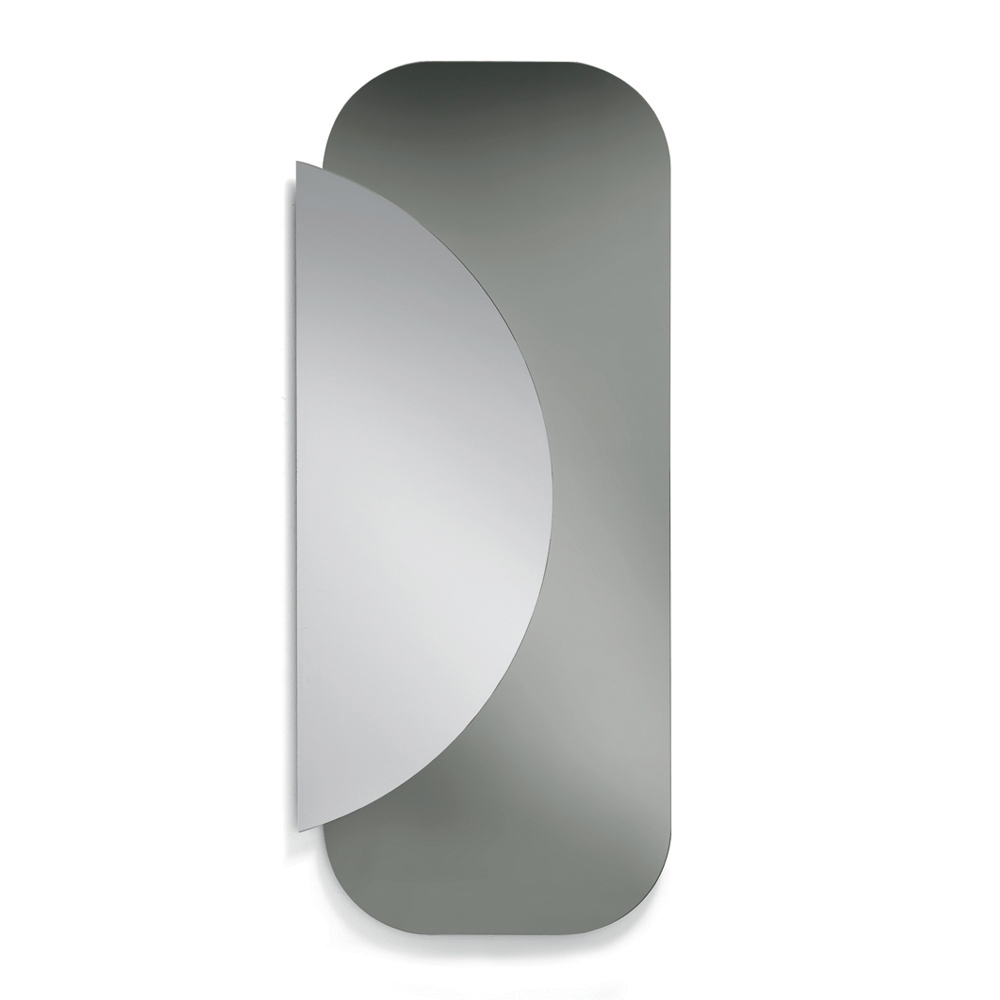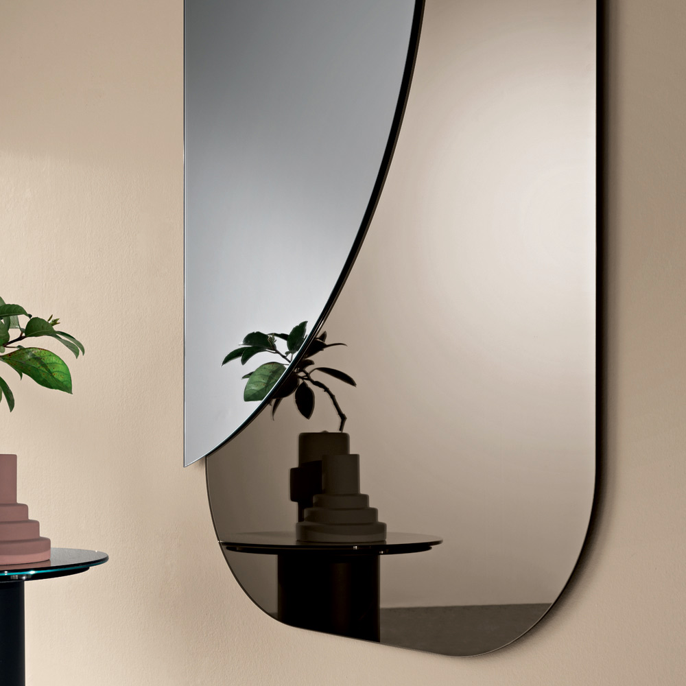 Kompozycja składa się z dwóch nakładających się na siebie płyt o różnych kształtach : prostokątnej podstawy o zaokrąglonych narożnikach i półkola z naturalnego lustra , które na siebie nachodzą, tworząc elegancki dialog między geometrią a odbiciami. Ten kontrast kształtów i materiałów tworzy dynamiczny i nowoczesny efekt wizualny.