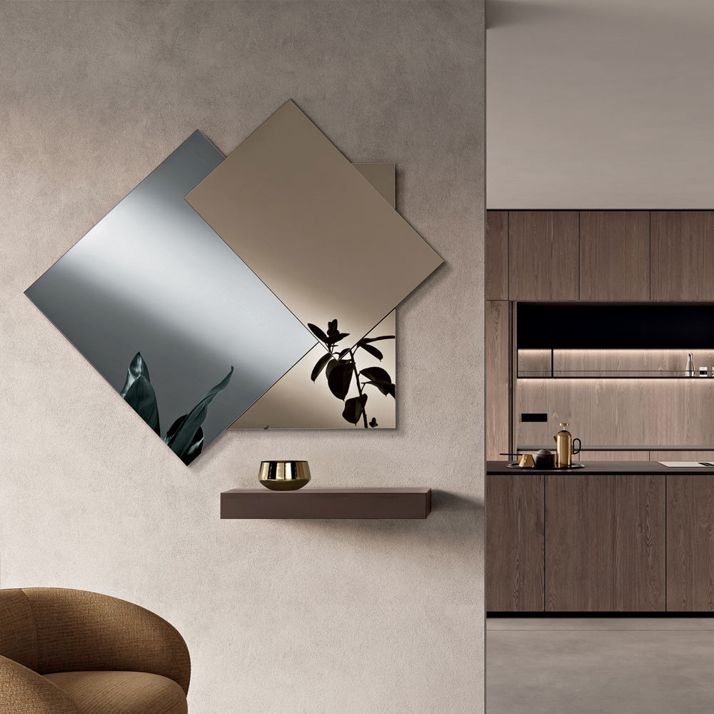 Rezultatem jest lustro o nowoczesnym i dynamicznym charakterze, idealne do nowoczesnych wnętrz, w których centralną rolę odgrywa ściana. Połączenie różnych odcieni tworzy ciepłe i wyrafinowane refleksy, potęgując jasność pomieszczenia.