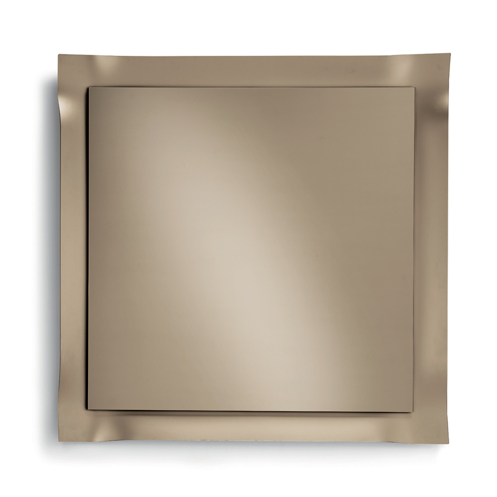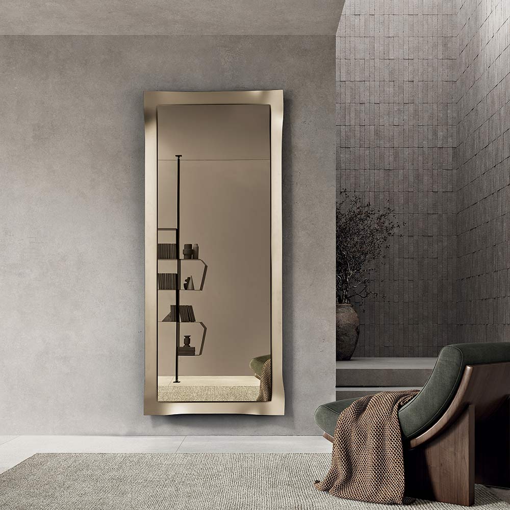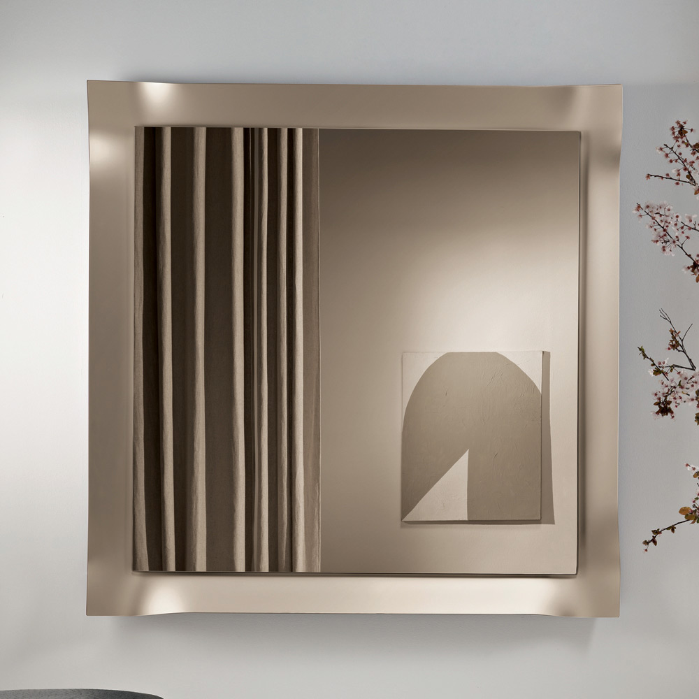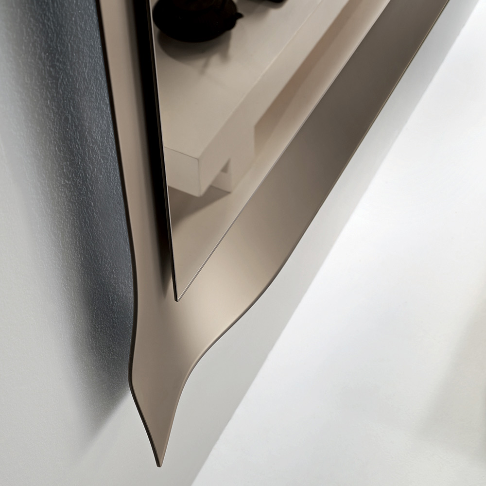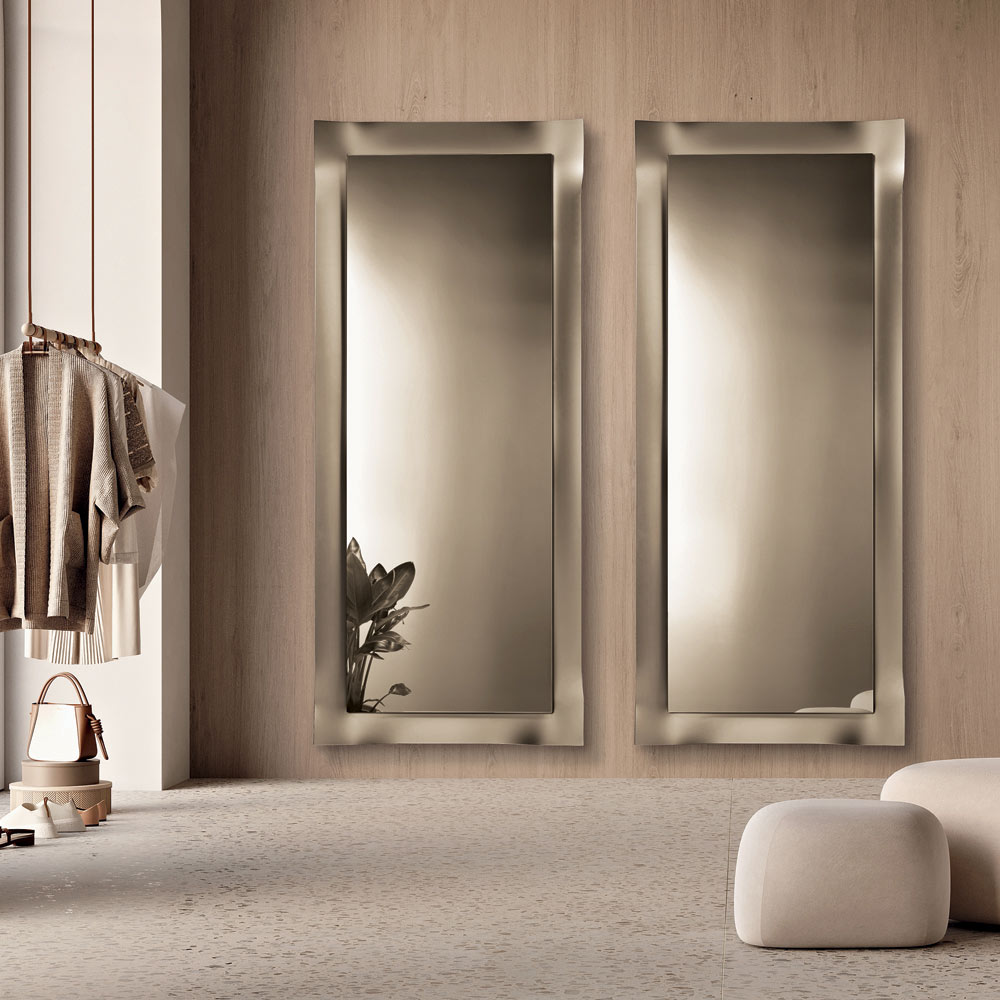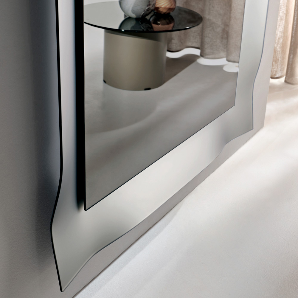 Odbijająca powierzchnia jest obramowana matową szklaną ramą o lekko zaokrąglonych narożnikach . Ten proces delikatnie wychwytuje i załamuje światło, tworząc elegancką grę odbić, która ożywia powierzchnię i nadaje lustru głębię.
