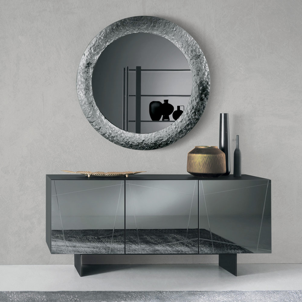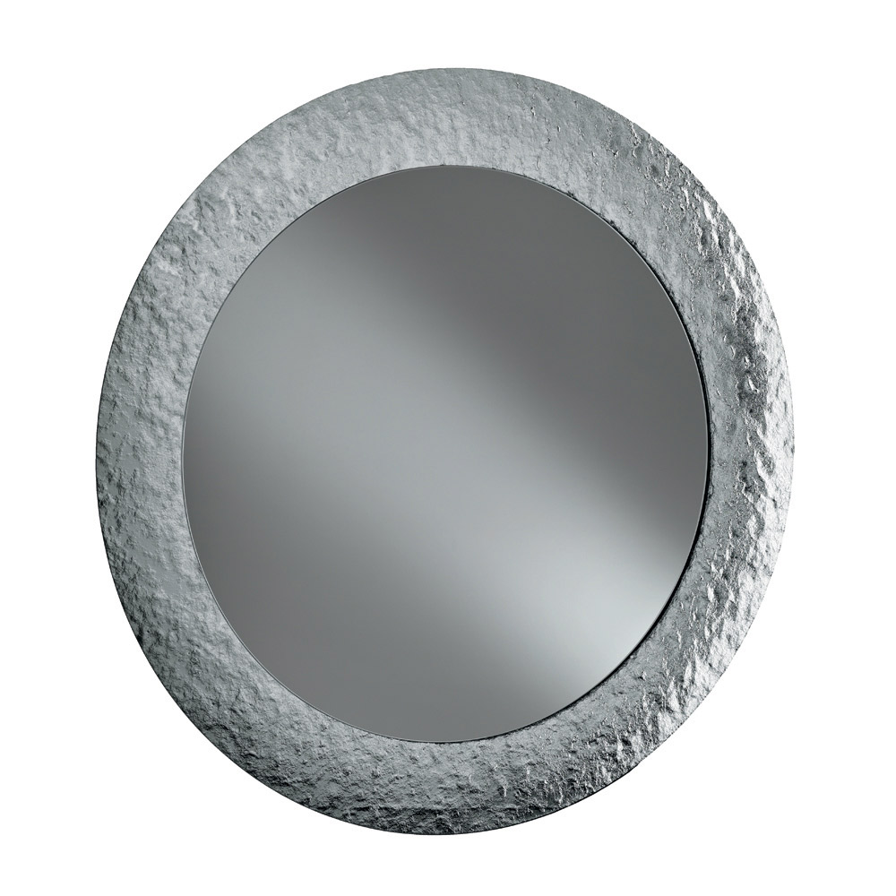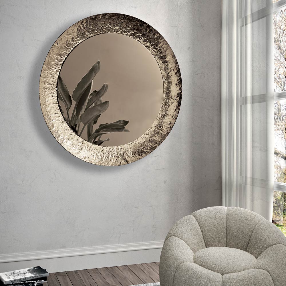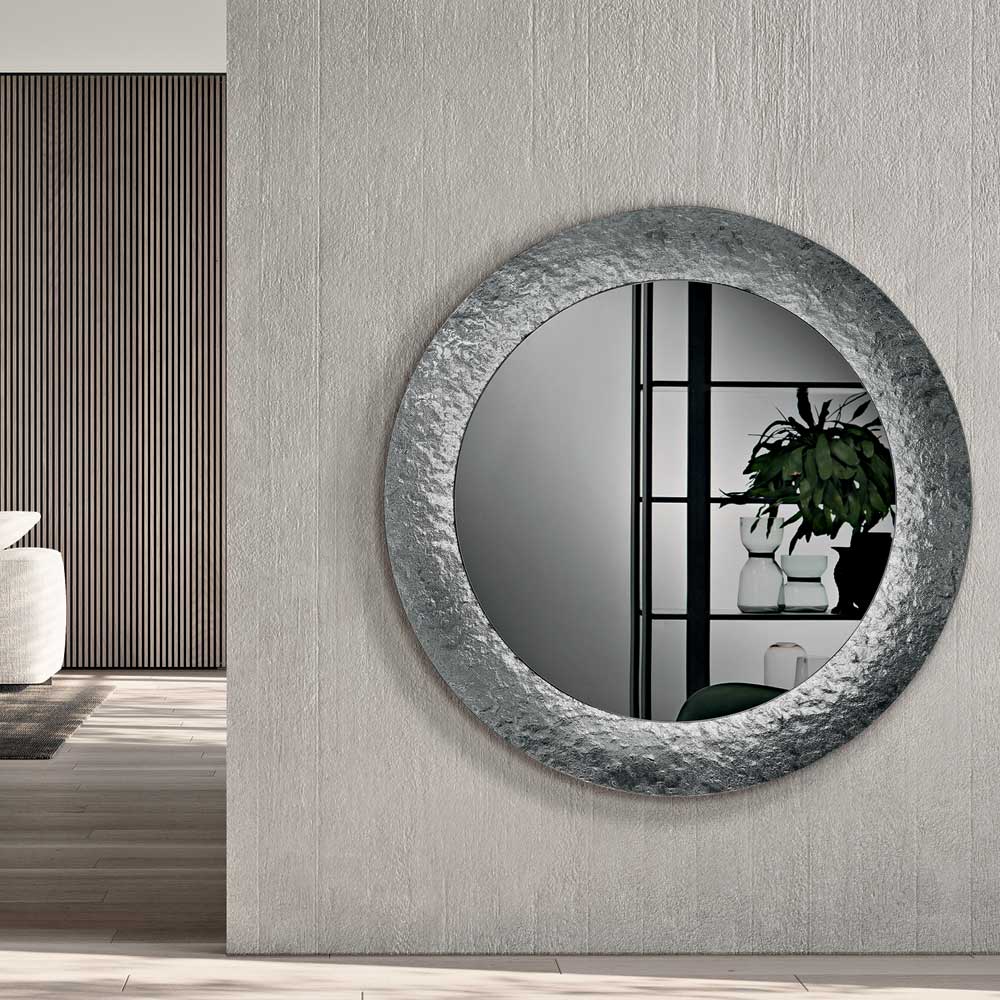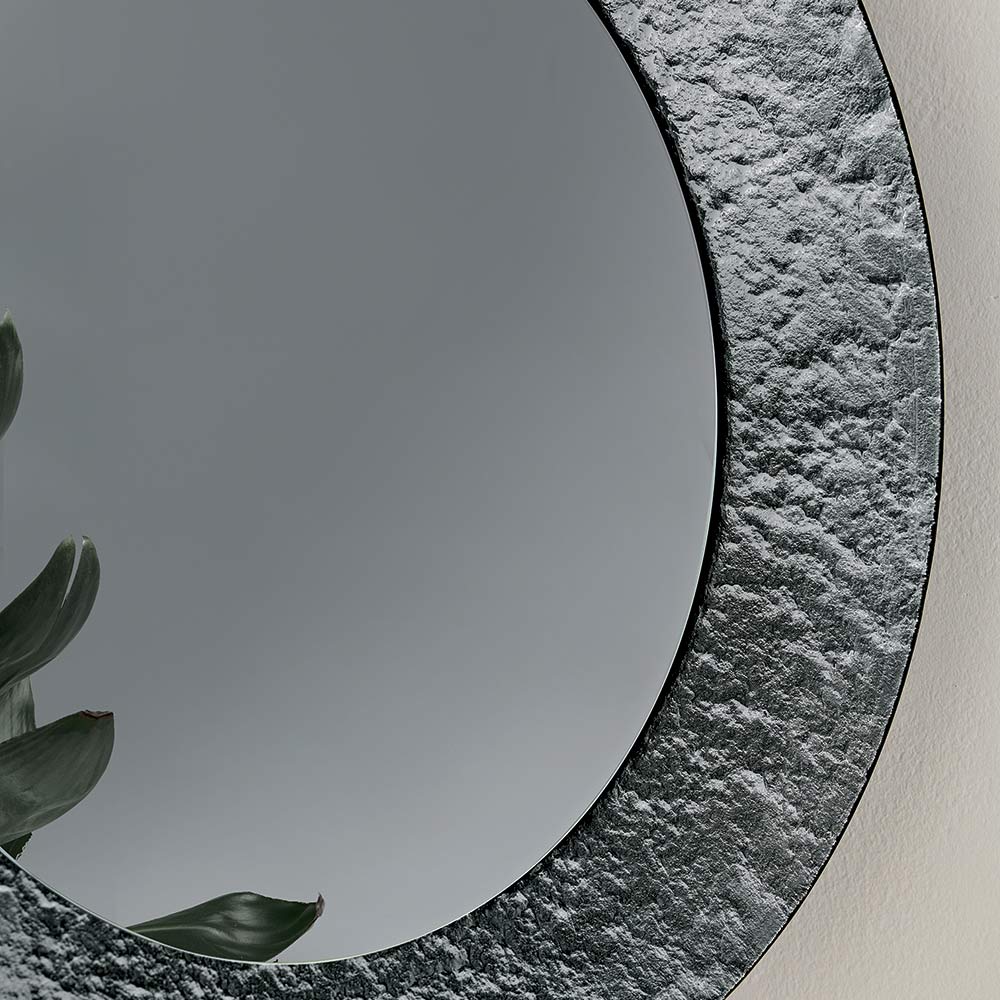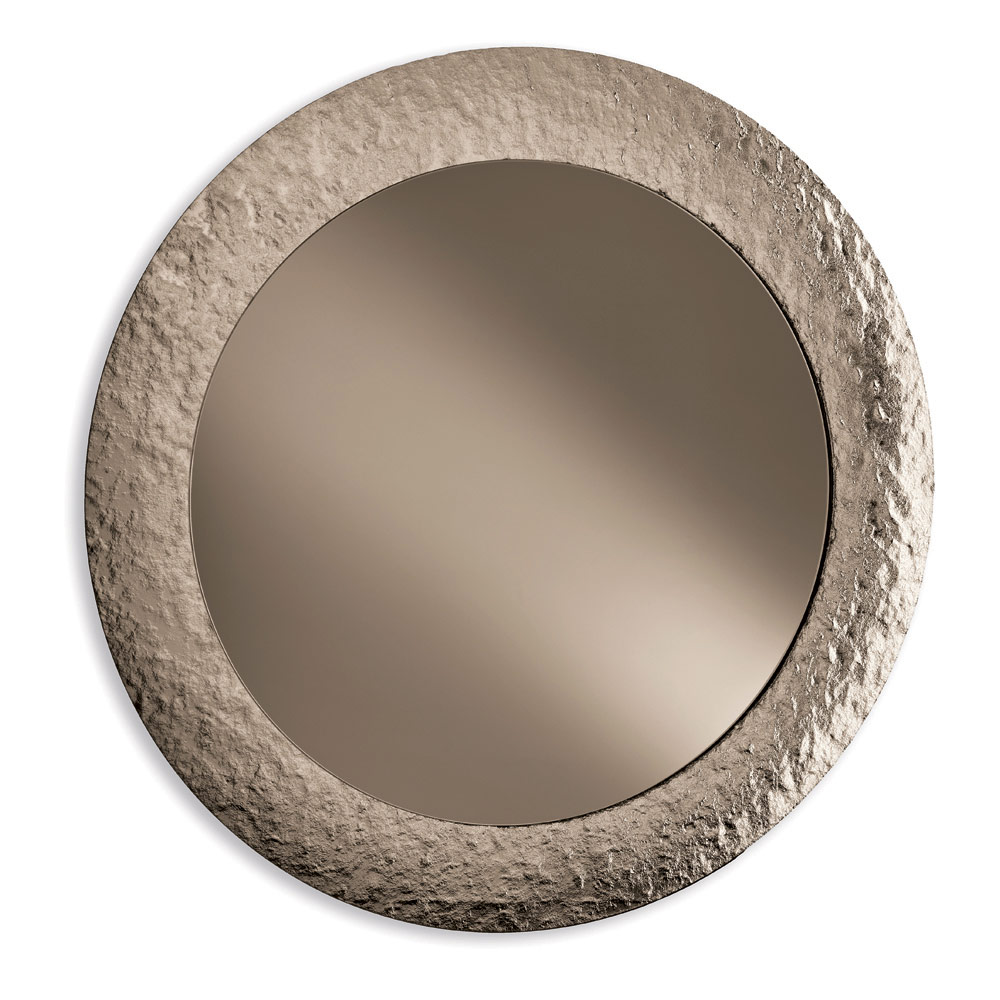 Lustro ma okrągły kształt , ozdobiony tonowaną, srebrną ramą z młotkowanego szkła , nadającą powierzchni wyrazisty, teksturowany charakter. Unikalne wykończenie delikatnie odbija światło, tworząc elegancką grę, która podkreśla przestrzeń, nie narzucając się przy tym.