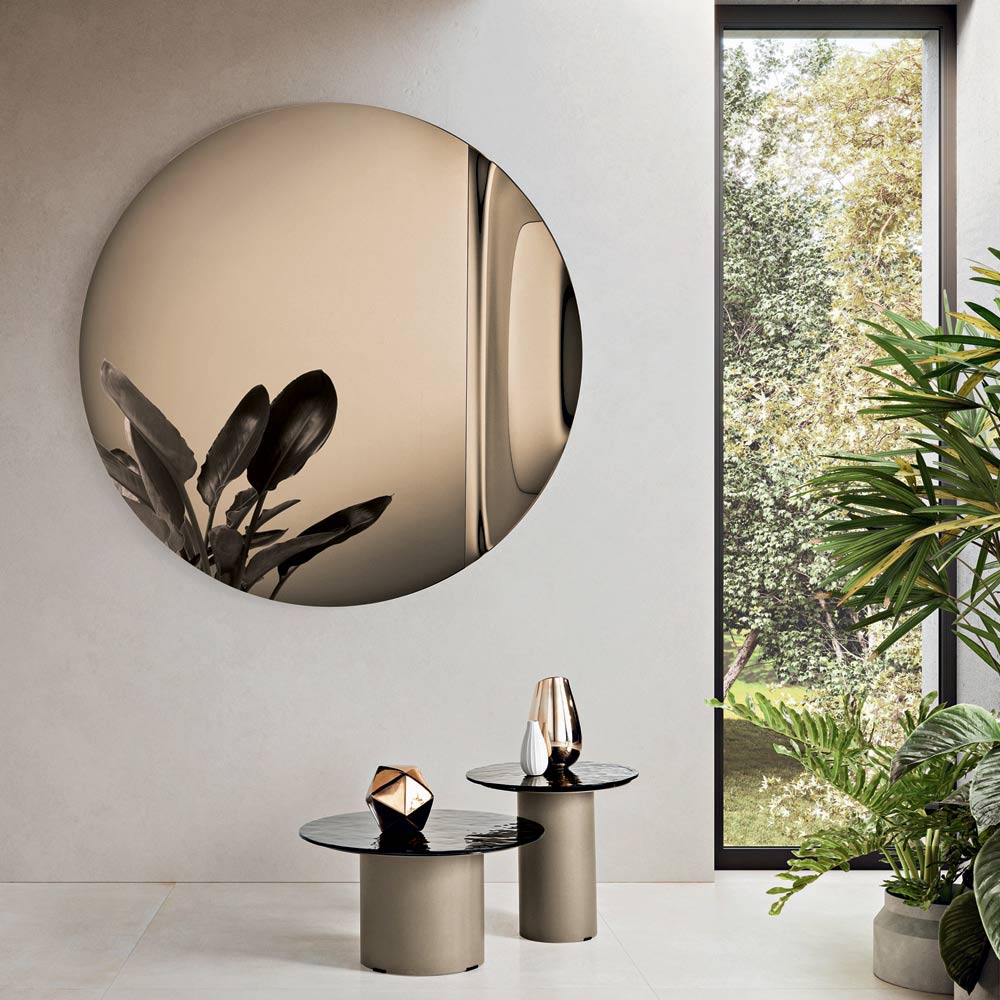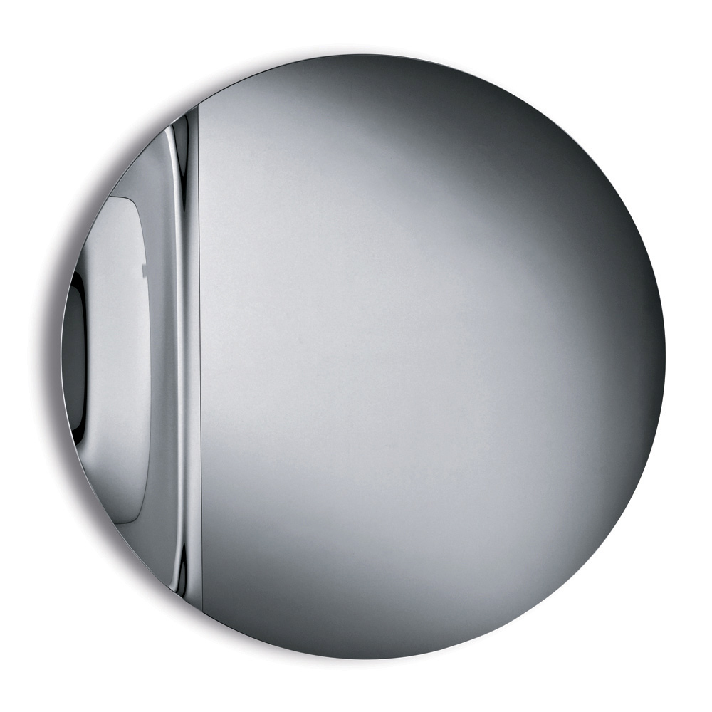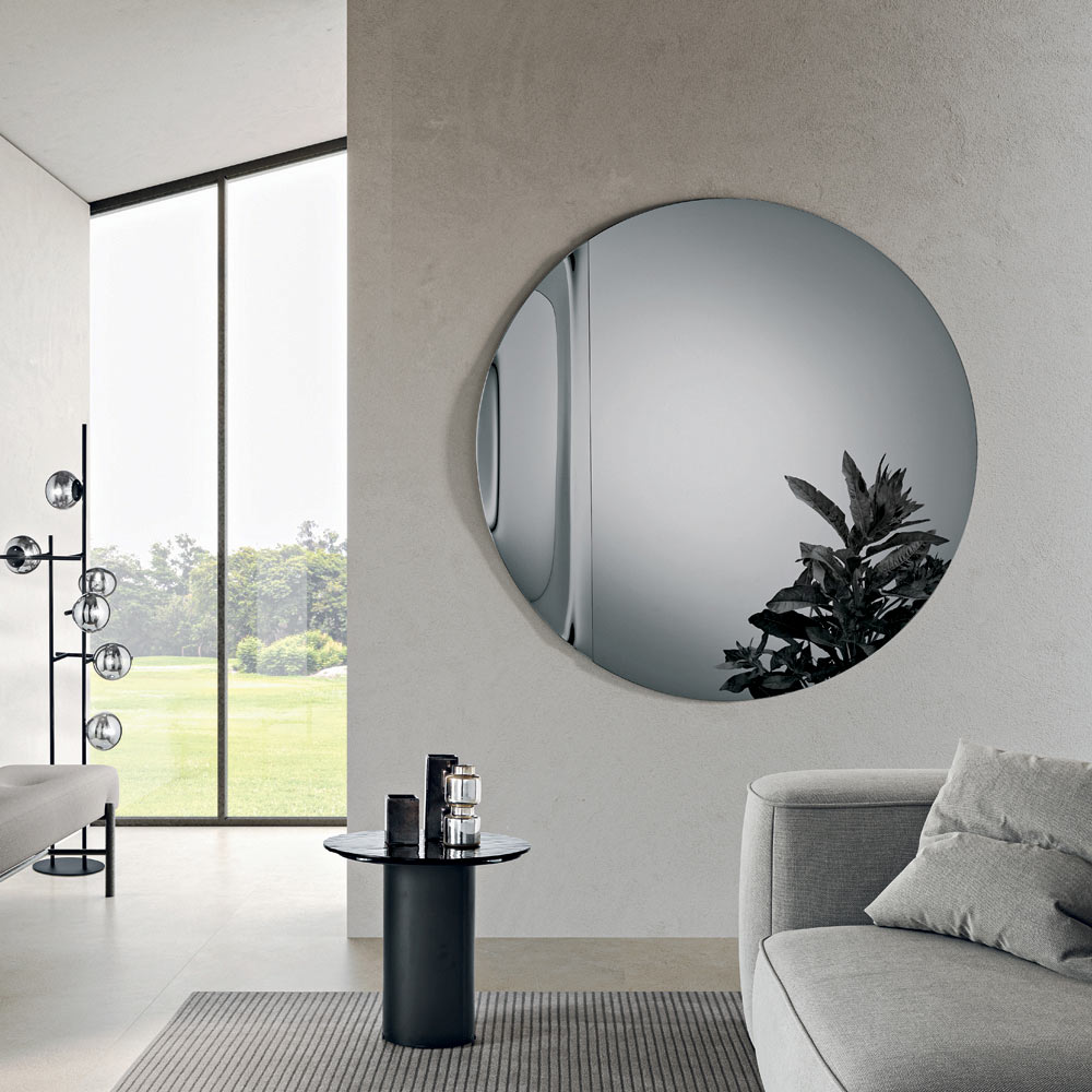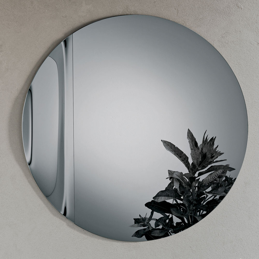Lustro ma okrągły kształt wykonany z odlewanego szkła , ozdobiony boczną falą , która elegancko przerywa idealną symetrię koła. Ten delikatny detal tworzy wyrafinowaną grę odbić i nadaje lustru rzeźbiarski, a zarazem lekki wygląd.