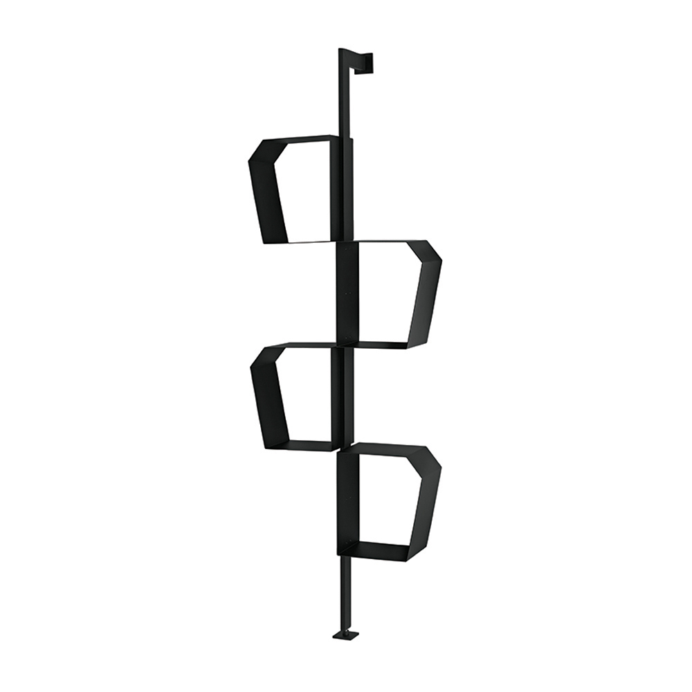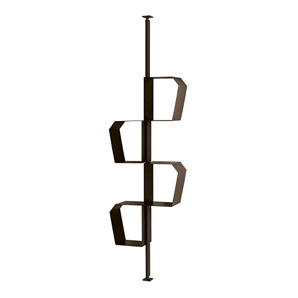 Wykonany z malowanego metalu regał charakteryzuje się konstrukcją przerywaną półkami o ostrych krawędziach , tworzącymi dynamiczną sekwencję przegródek. Ten geometryczny wzór nadaje kompozycji rytmu i głębi, dzięki czemu idealnie nadaje się do eleganckiej ekspozycji książek i przedmiotów dekoracyjnych.