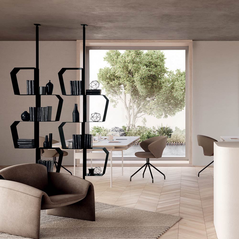 Dzięki wszechstronnej konfiguracji regał można zamontować za pomocą mocowań ściennych lub sufitowych . W wersji sufitowej może również pełnić funkcję elementu dzielącego , idealnego do podziału przestrzeni przy jednoczesnym zachowaniu optycznej lekkości.