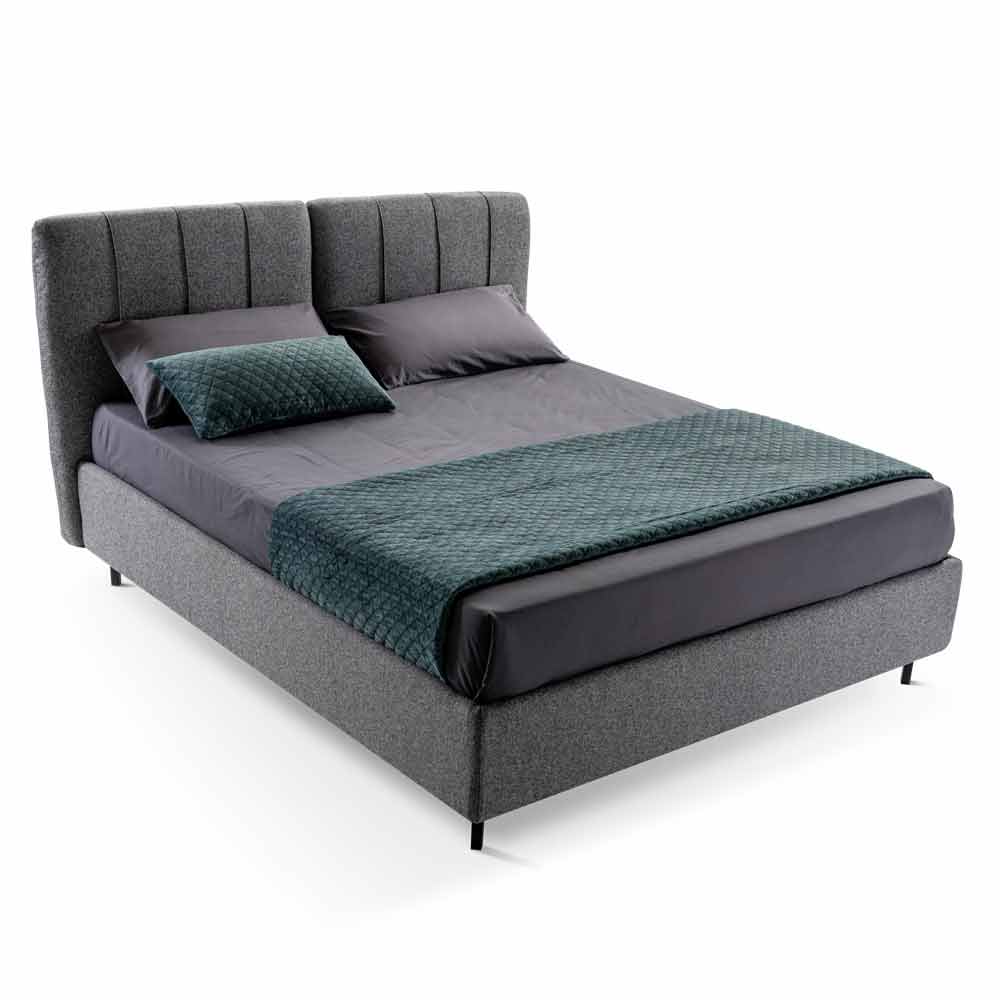 Luksusowe, nowoczesne łóżko podwójne z materiałowym pojemnikiem do przechowywania i metalowymi nóżkami, ręcznie wykonane we Włoszech.