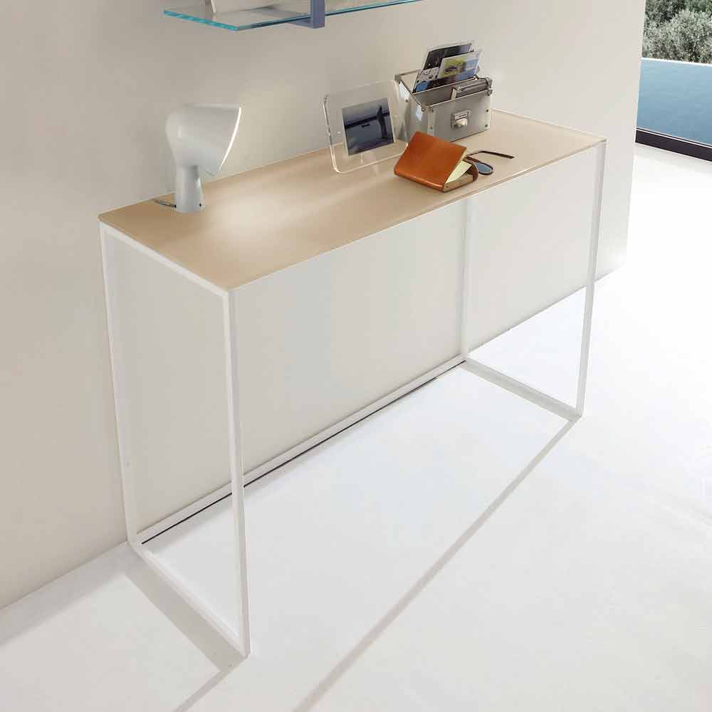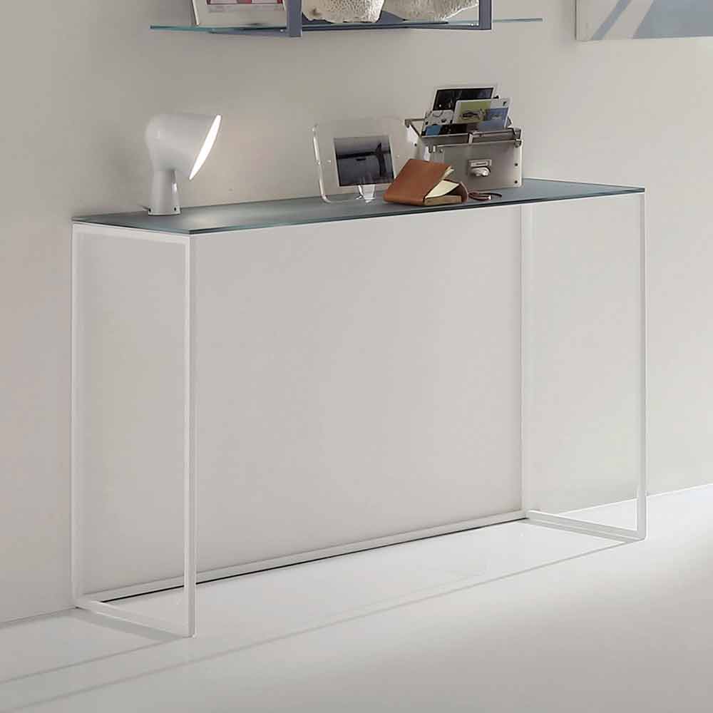 Nowoczesna konsola wykonana we Włoszech ze szklanym blatem i metalową konstrukcją malowaną na biało . Proste i wszechstronne rozwiązanie umeblowania, które jest w stanie scharakteryzować każdą przestrzeń, nadając styl otaczającemu środowisku. Jej zasadnicze linie pozwalają pełnić rolę praktycznej powierzchni nośnej w różnych miejscach domu, takich jak wejście czy salon, będąc jednocześnie doskonałym elementem dekoracyjnym mogącym uzupełnić mebel. Dzięki wyborowi, który połączysz niekwestionowaną nowoczesność metalu z ponadczasową elegancją kryształu i jego wspaniałymi wykończeniami, efekt końcowy zaowocuje innowacyjnym i oryginalnym pomysłem, który może uczynić każde pomieszczenie wyjątkowym, aczkolwiek w jego ekstremalnej prostocie.
