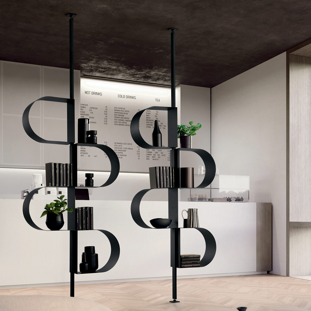 Wszechstronny i funkcjonalny regał dostępny jest z montażem na ścianie lub suficie . Wersja montowana na suficie może również służyć jako ścianka działowa, tworząc subtelne podziały bez obciążania przestrzeni.
