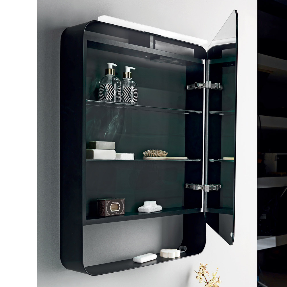 Pojedyncze drzwi otwierają się, odsłaniając poręczną przestrzeń do przechowywania, idealną do przechowywania artykułów kosmetycznych i pielęgnacyjnych w porządku i łatwo dostępnych. Światło LED zapewnia optymalne oświetlenie, niezbędne w codziennych zabiegach pielęgnacyjnych, dodając jednocześnie nowoczesnego akcentu.