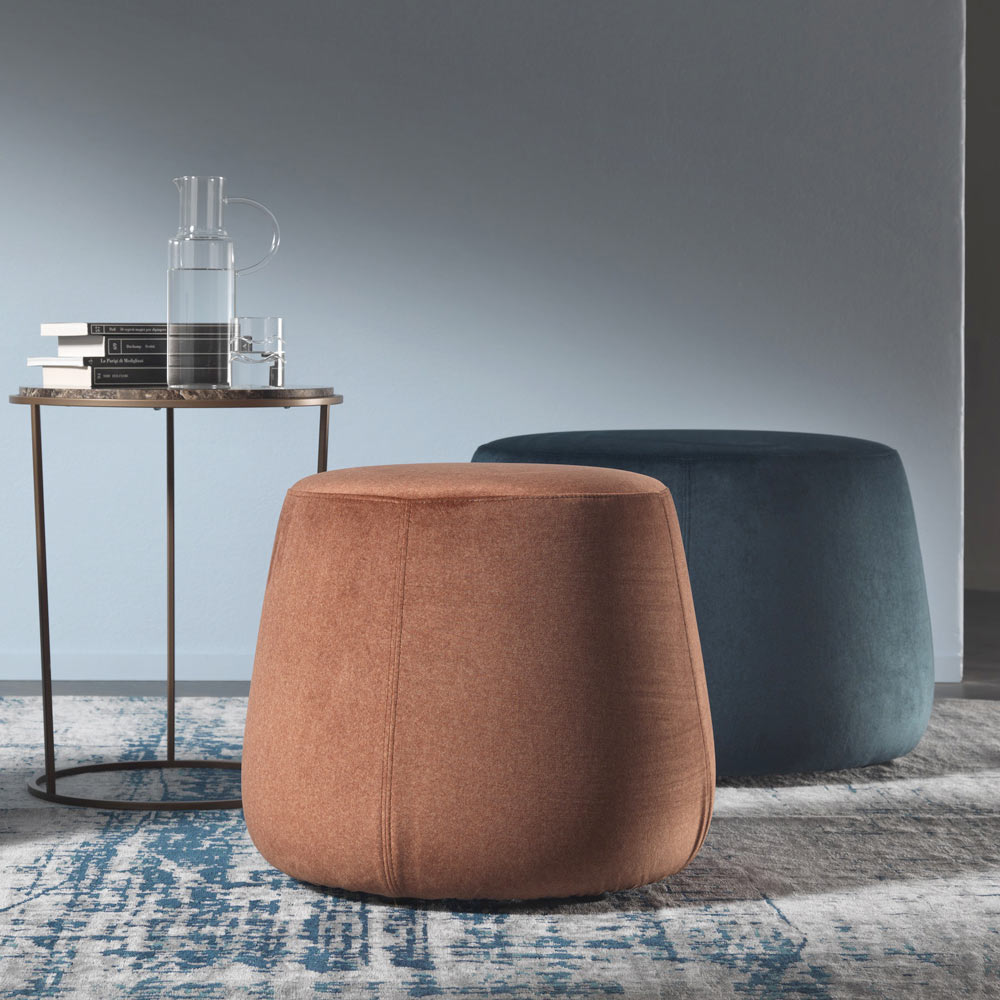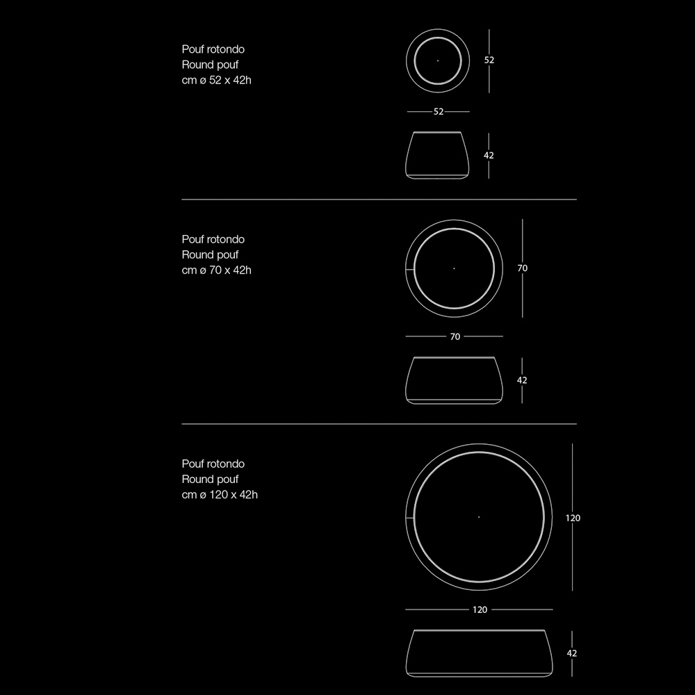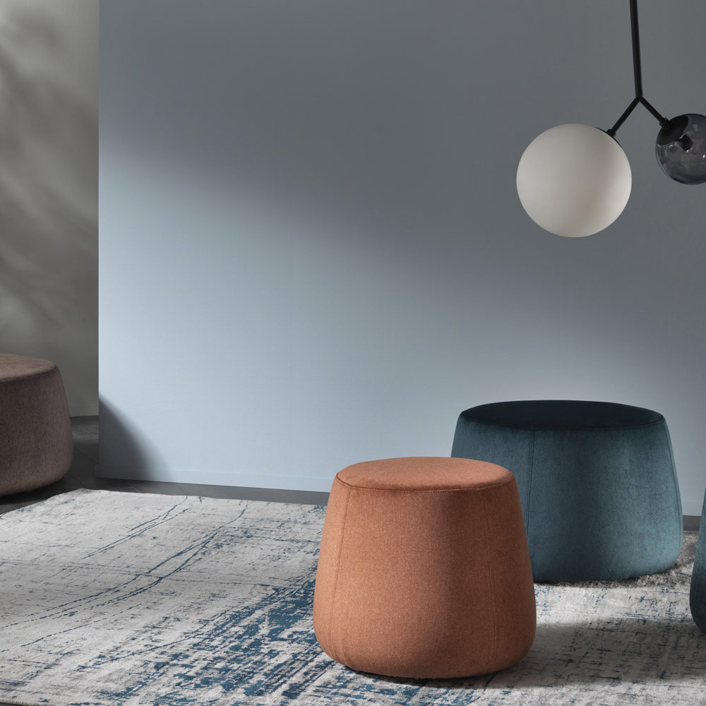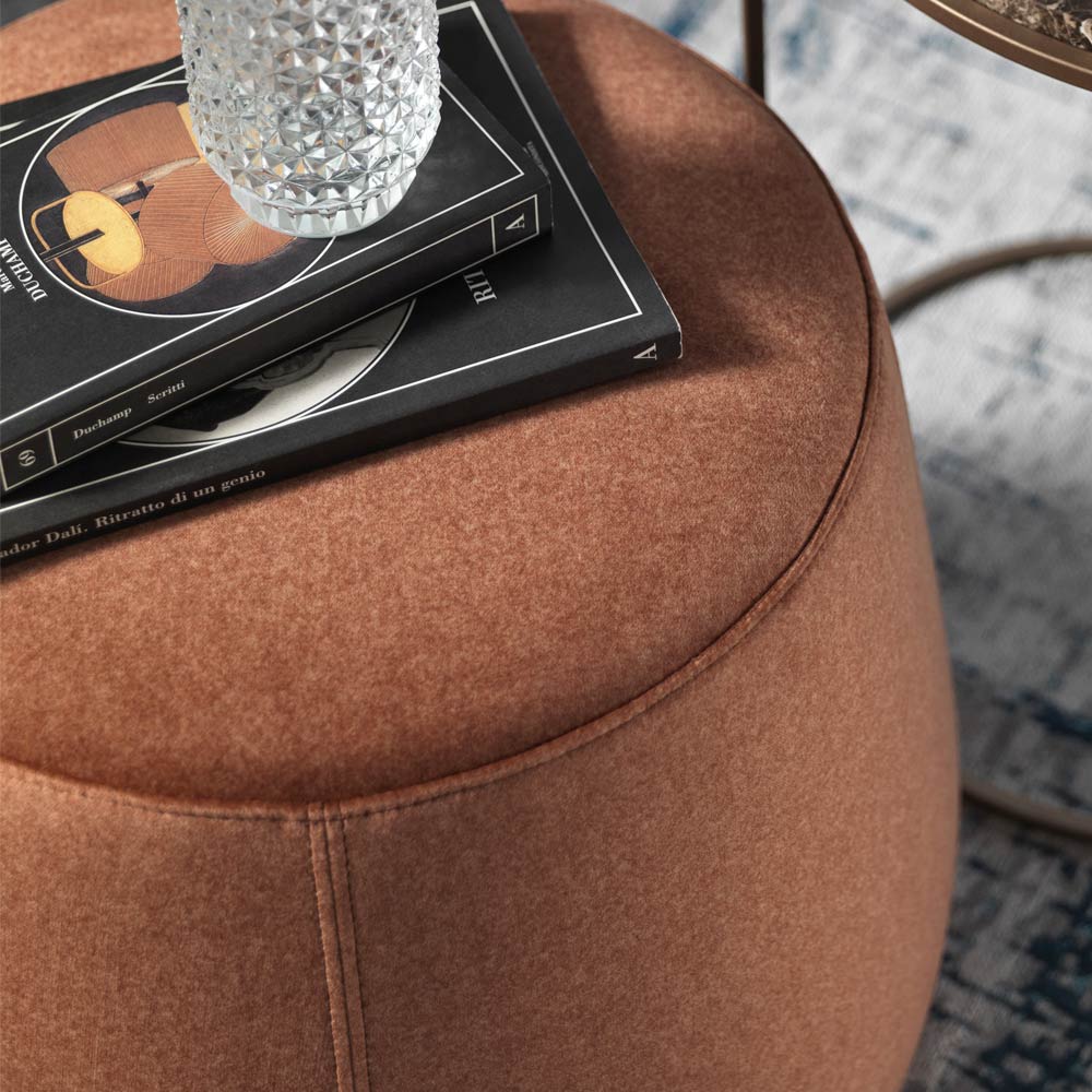 Nowoczesna i okrągła pufa, dostępna w trzech różnych szerokościach, jest całkowicie pokryta miękkim zdejmowanym aksamitem dostępnym w 6 wykończeniach.