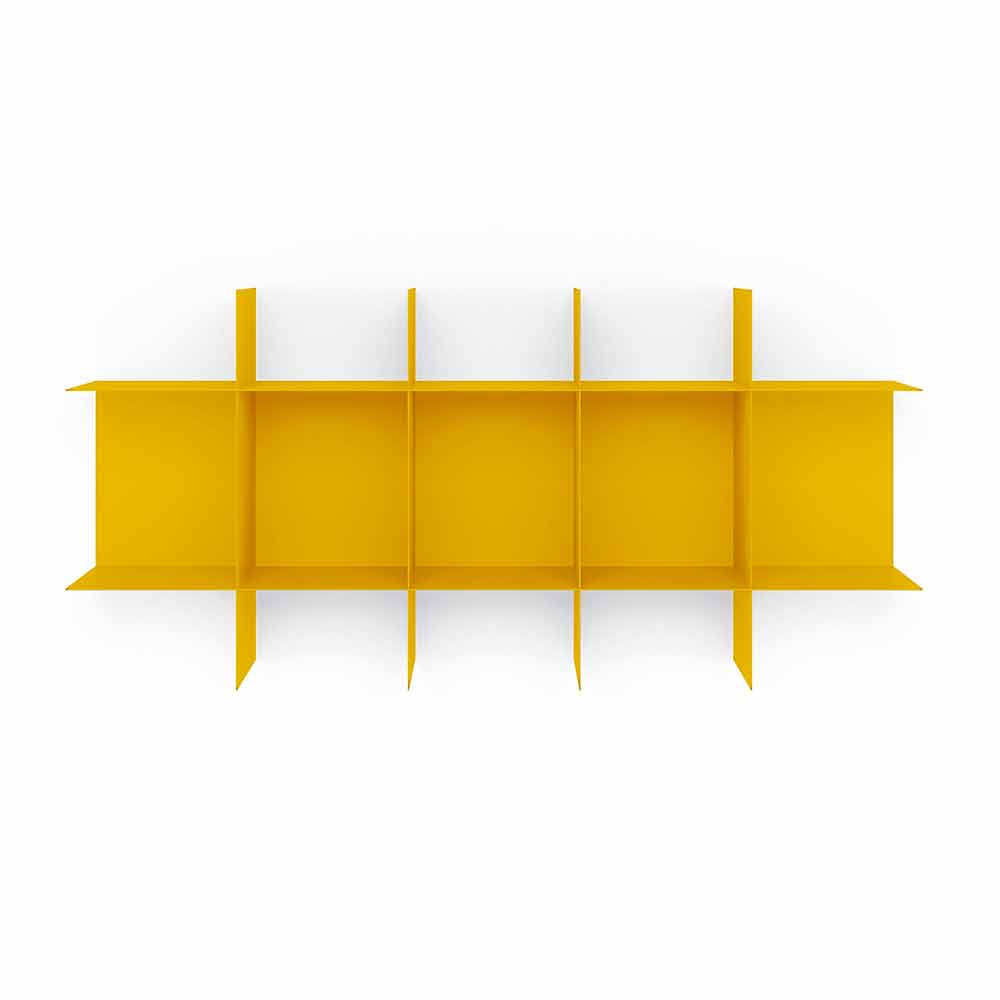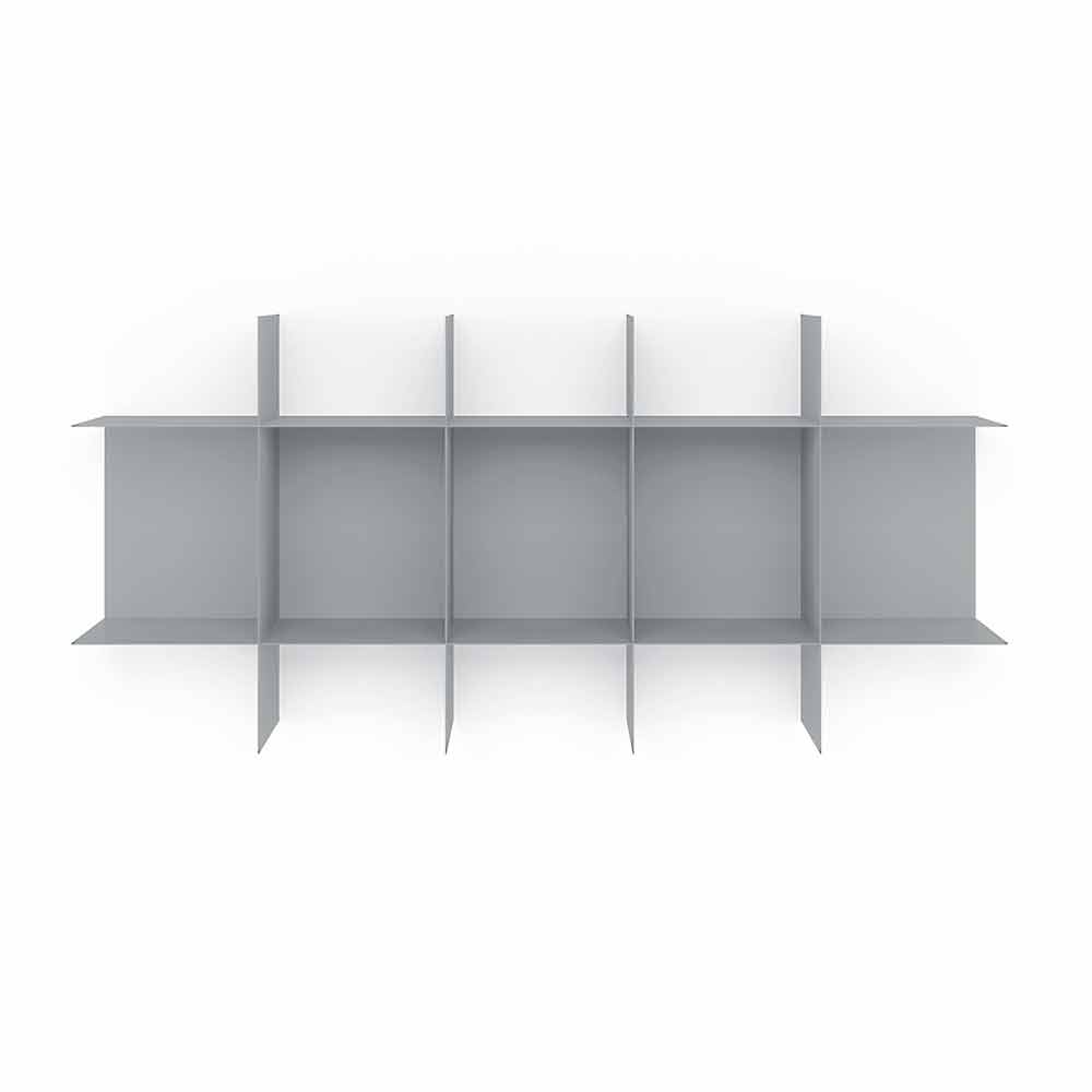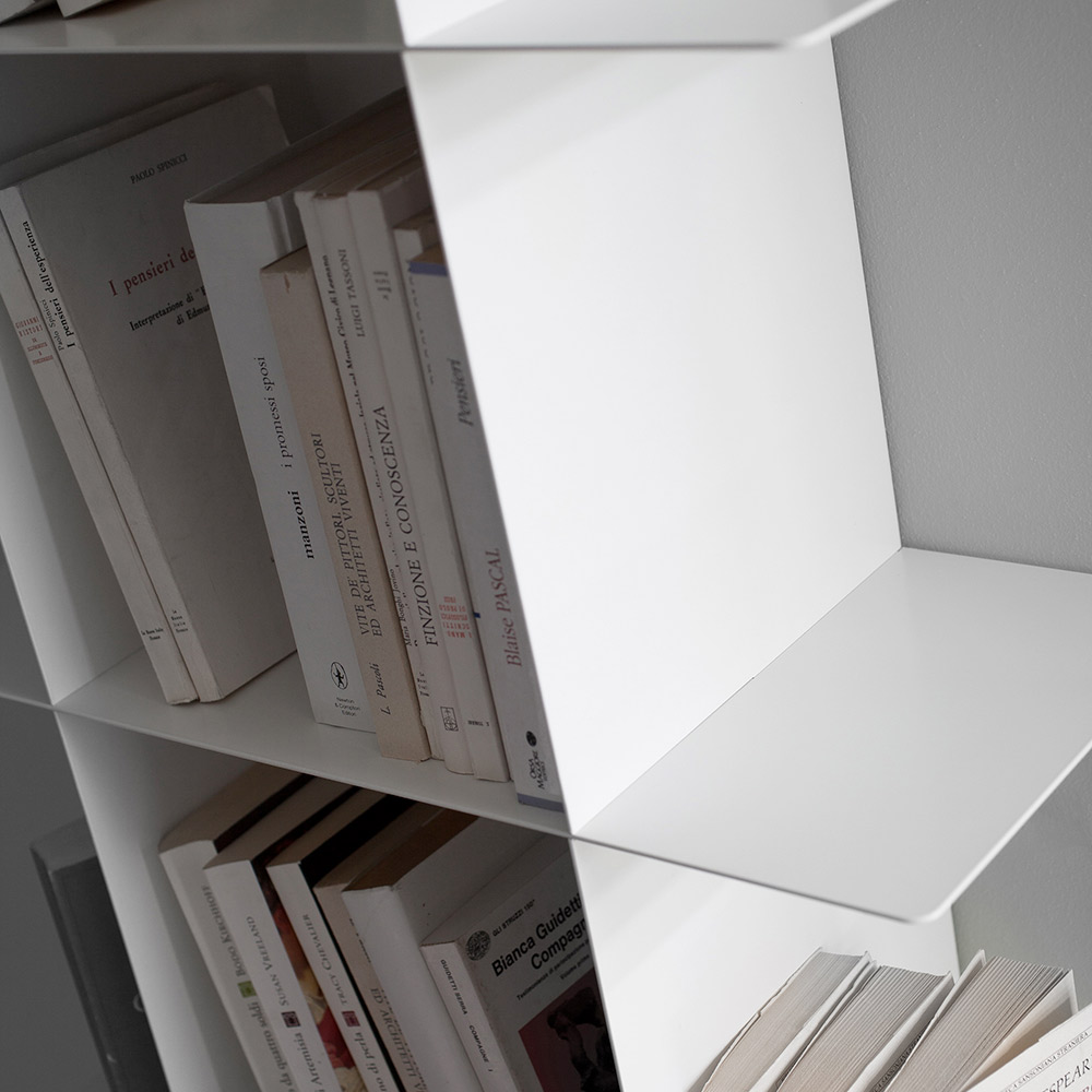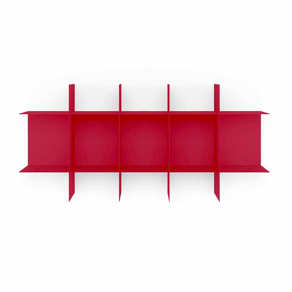 Ten modułowy regał stalowy składa się z centralnego modułu podstawowego, który można przymocować do ściany oraz czterech półek, które idealnie pasują do modułu, tworząc wzór kwadratowych przegródek, o geometrycznym i współczesnym designie , eleganckim i wyrafinowanym w swojej prostocie.