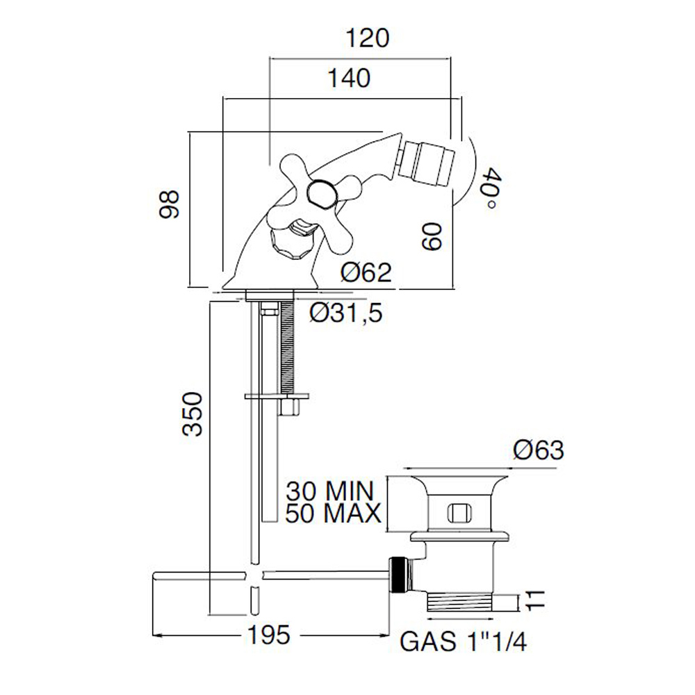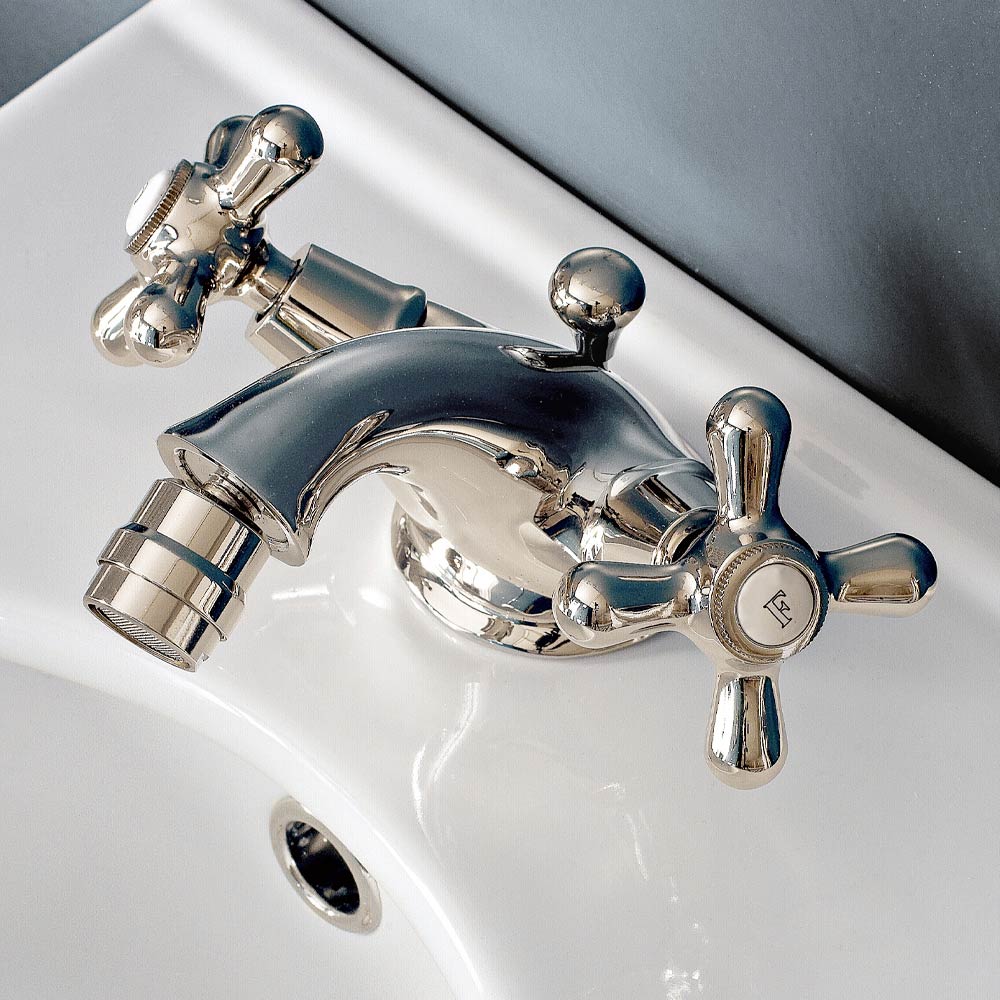 Jednootworowa bateria bidetowa z ręcznie wykonaną mosiężną spłuczką wyprodukowana we Włoszech.