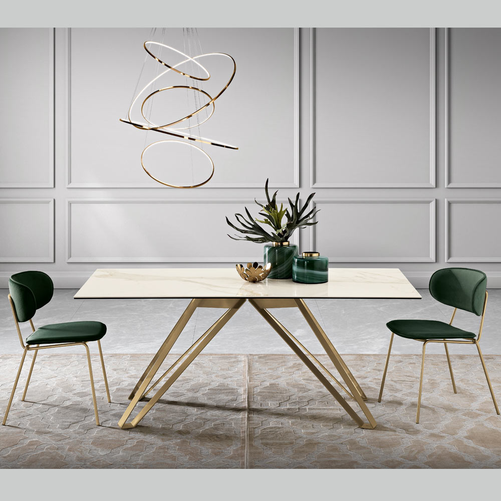 Zachwycający kontrastem materiałów i kolorów, ten stół jest prawdziwym wyrazem luksusu i nowoczesnego designu. Blat szklano-ceramiczny z efektem marmuru calacatta w delikatnych odcieniach to celebracja naturalnej elegancji, wytrzymałej, a jednocześnie niezwykle wyrafinowanej.
