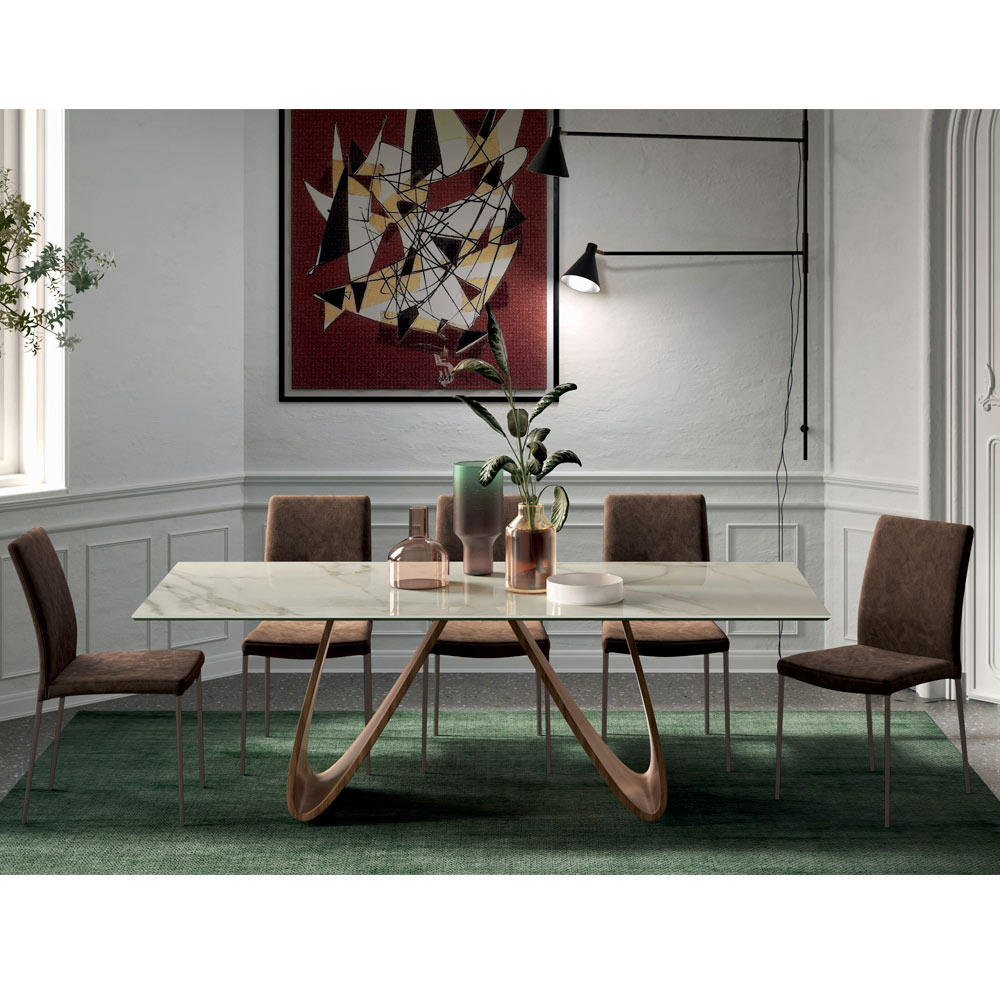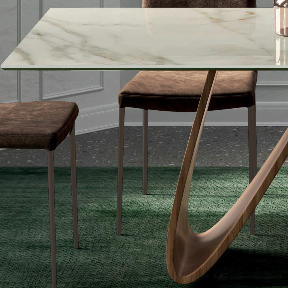 Dzięki kształtowi podstawy i dostępnym wykończeniom blatu stół może nadać