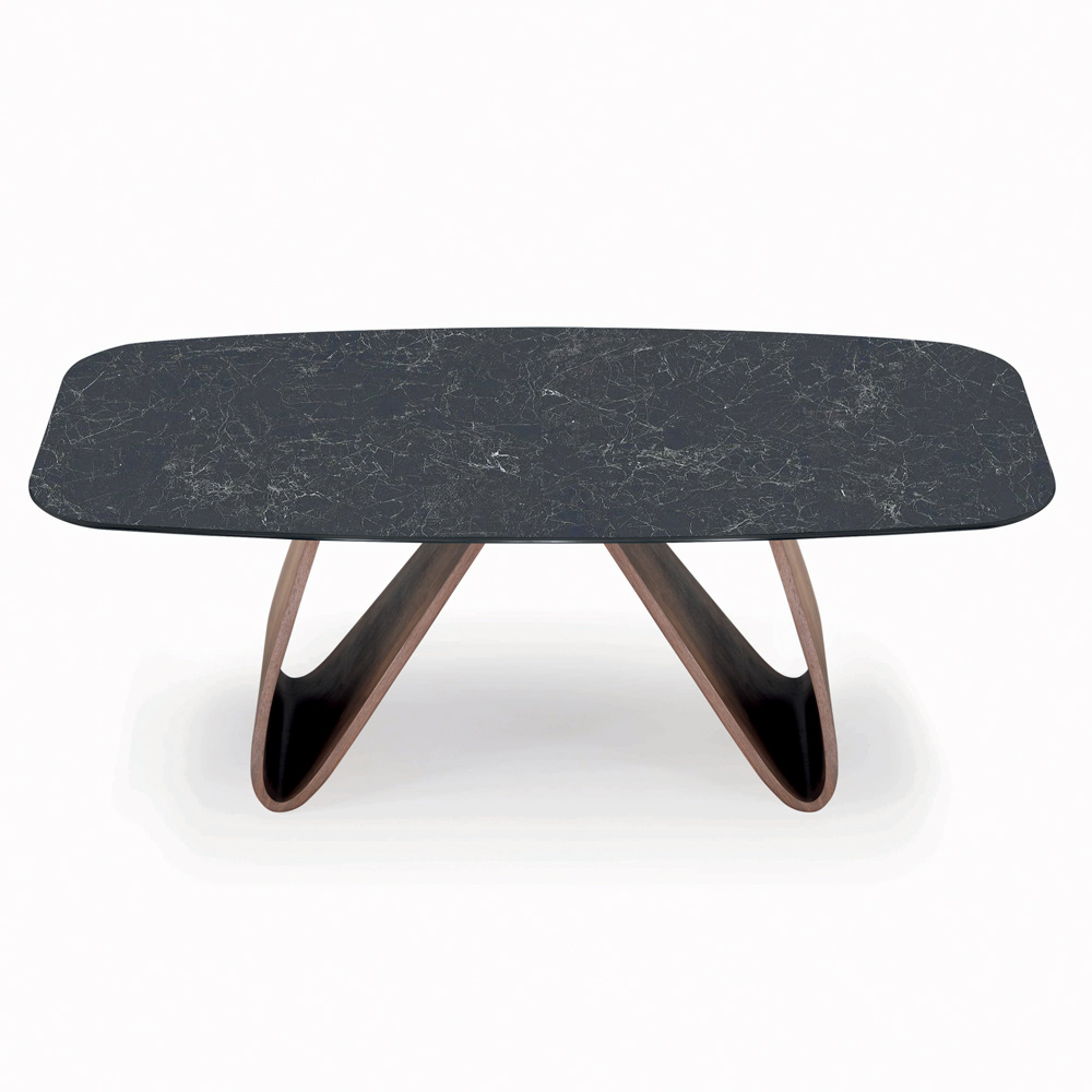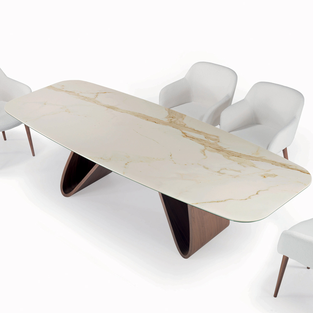 Dzięki kształtowi podstawy i dostępnym wykończeniom blatu stół może nadać