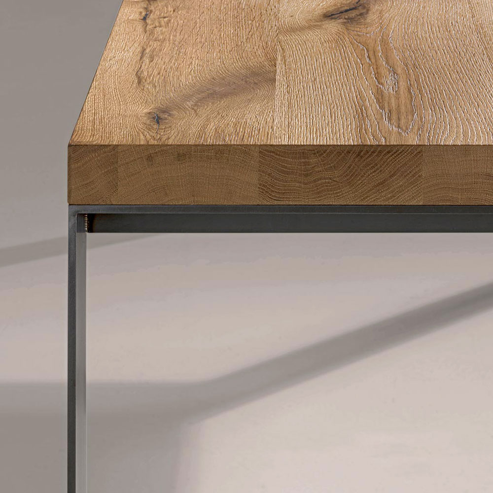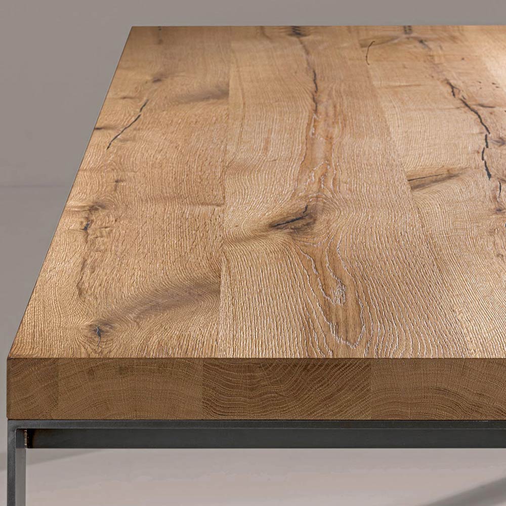 Stały stół fornirowany na naturalnej płycie wiórowej z topoli łupanej, z metalowymi nogami z wykończeniem żelaznym . Wymiary wys. 78 cm, grubość 6 cm.
